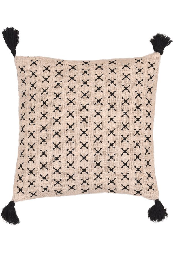 כרית נוי מושלמת בגווון בז׳ עם דוגמאות איקסים, ו4 קבוצות פרנזים שחורים בקצוות הכרית עם קונטרסט מהמם בעיצוב בוהו שיק מודרני.