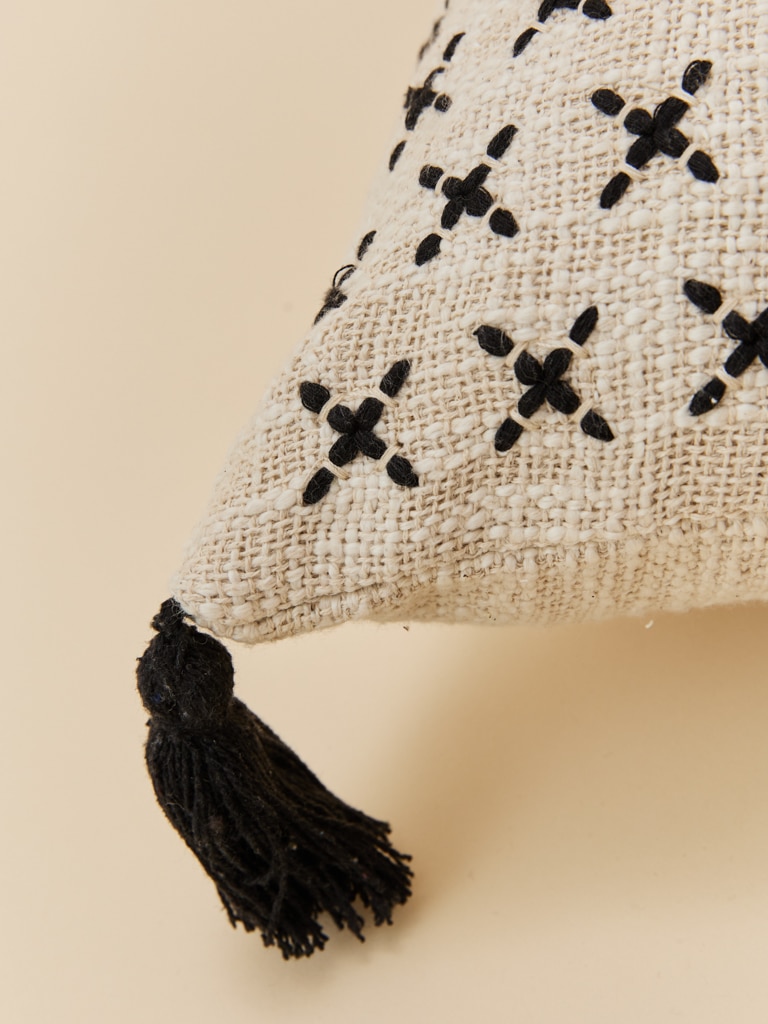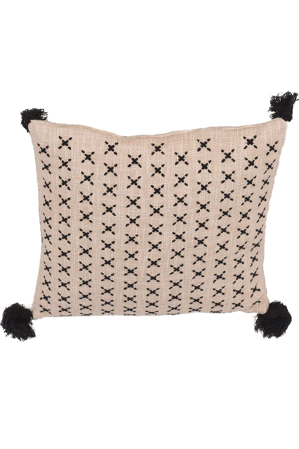 כרית נוי מושלמת בגווון בז׳ עם דוגמאות איקסים, ו4 קבוצות פרנזים שחורים בקצוות הכרית עם קונטרסט מהמם בעיצוב בוהו שיק מודרני.