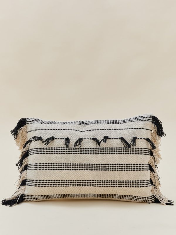 כרית נוי בעיצוב בוהו שיק מטריף וסופר טרנדי עם פרנזים שחורים בגבולות הכרית, ודוגמא אתנית שחורה הארוגה על הבסיס הבהיר.