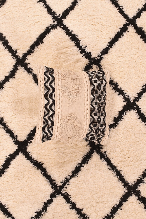 כרית נוי בעיצוב בוהו שיק עם פרנזים ודוגמאות אתניות בשחור ושמנת שיצרו עניין וסטייל בספה בסלון.