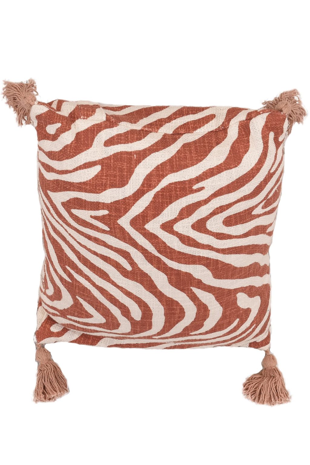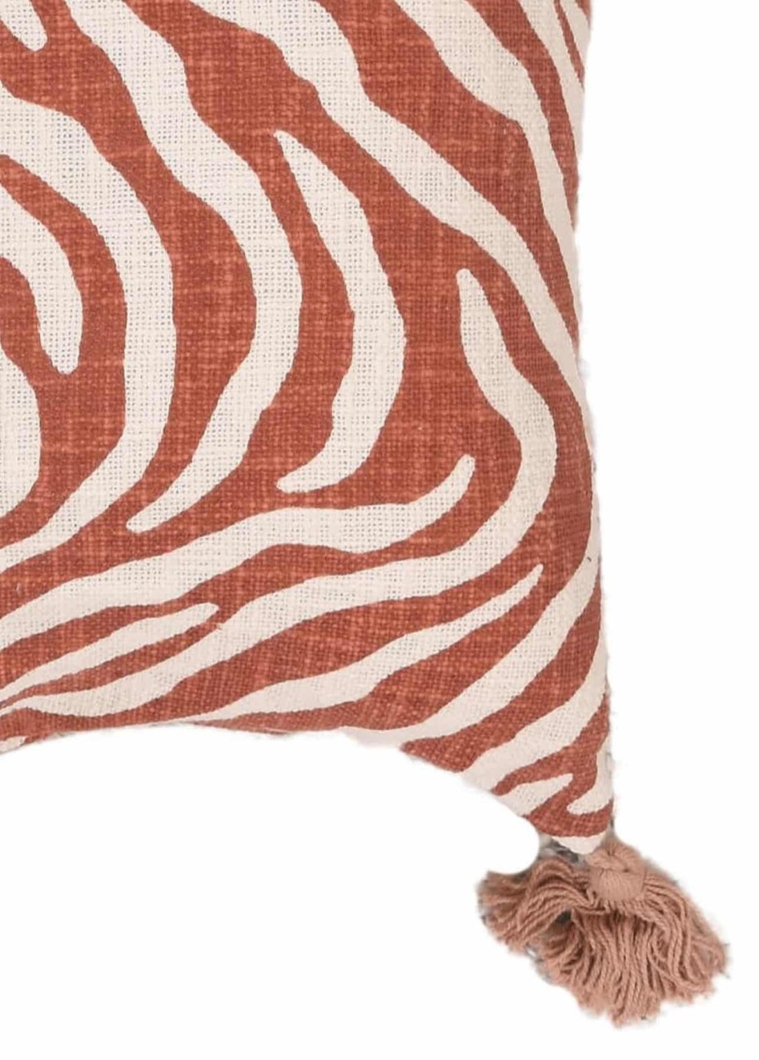 כרית נוי מושלמת בגווני חמרה לבן בדוגמת פסי זברה טרנדיים, בשילוב פרנזים הורסים הקשורים בקצוות.
