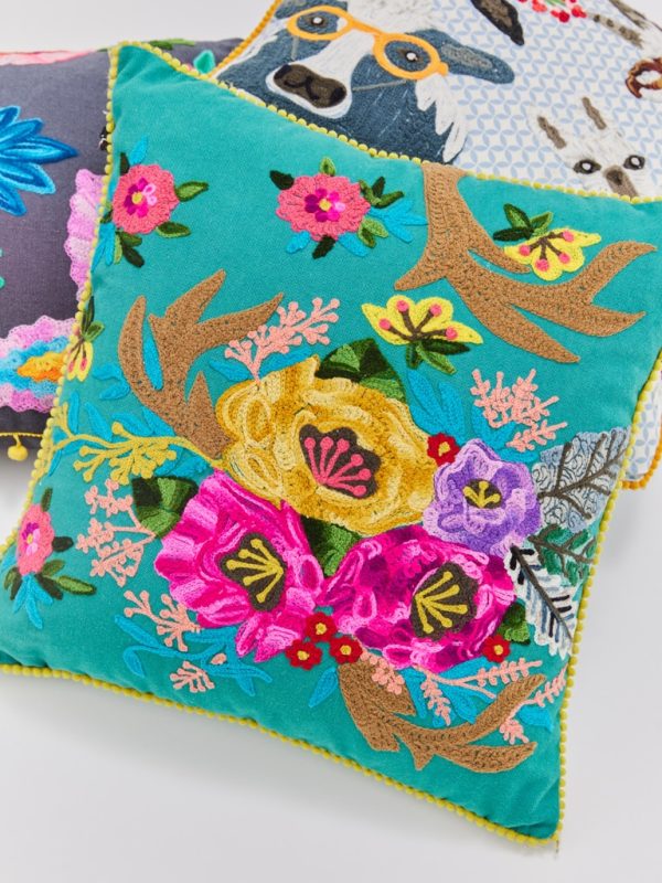 כרית נוי שחורה בעלת רקמה צבעונית עם לוק וינטג׳ מושלם, שתוסיף ים של סטייל לכל ספה או כורסא.