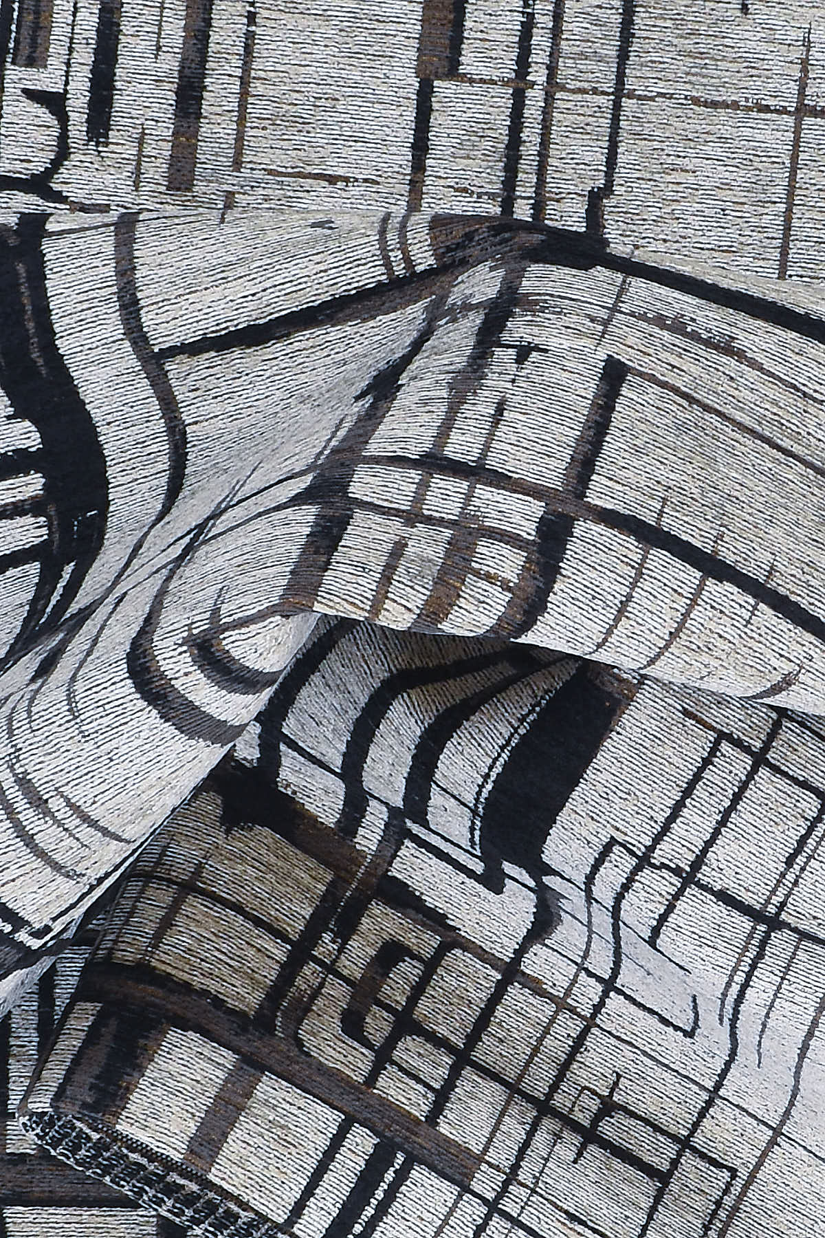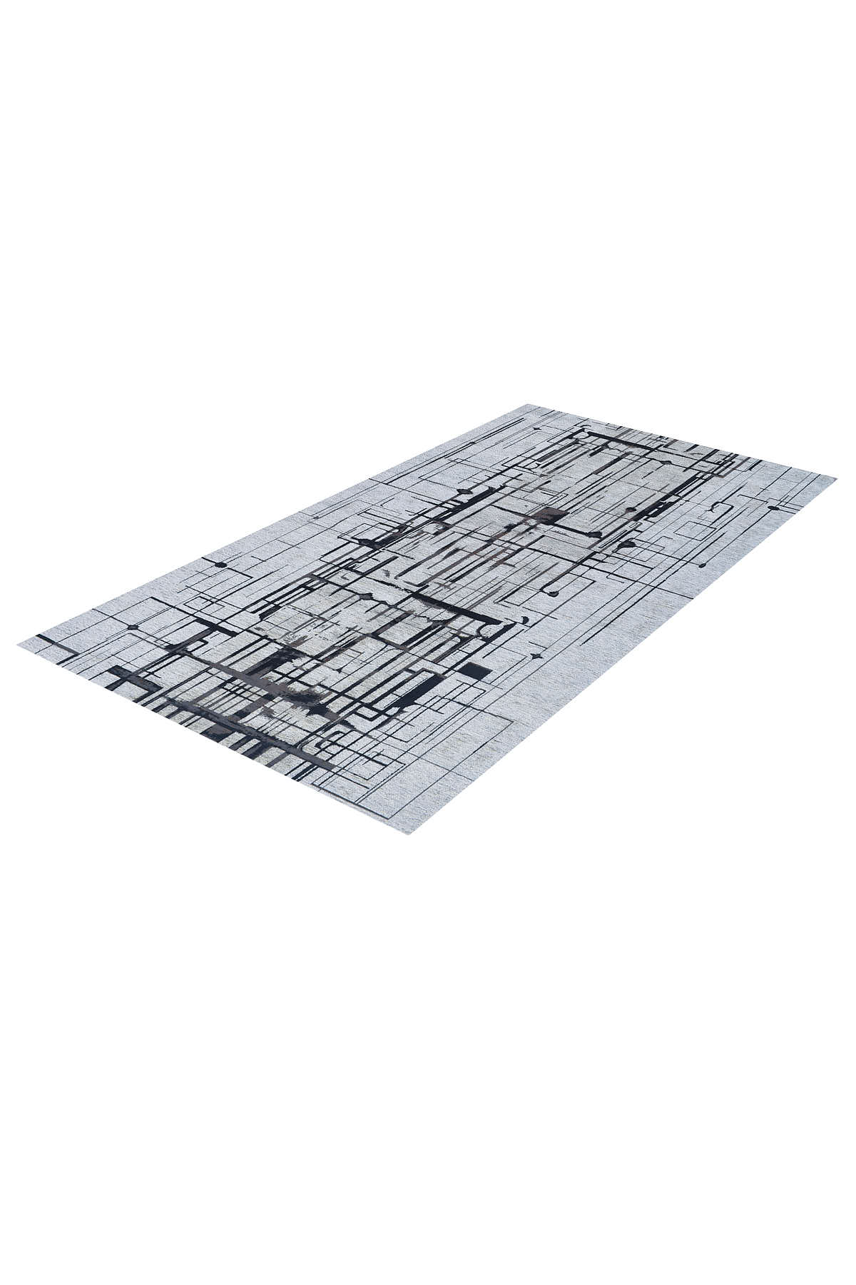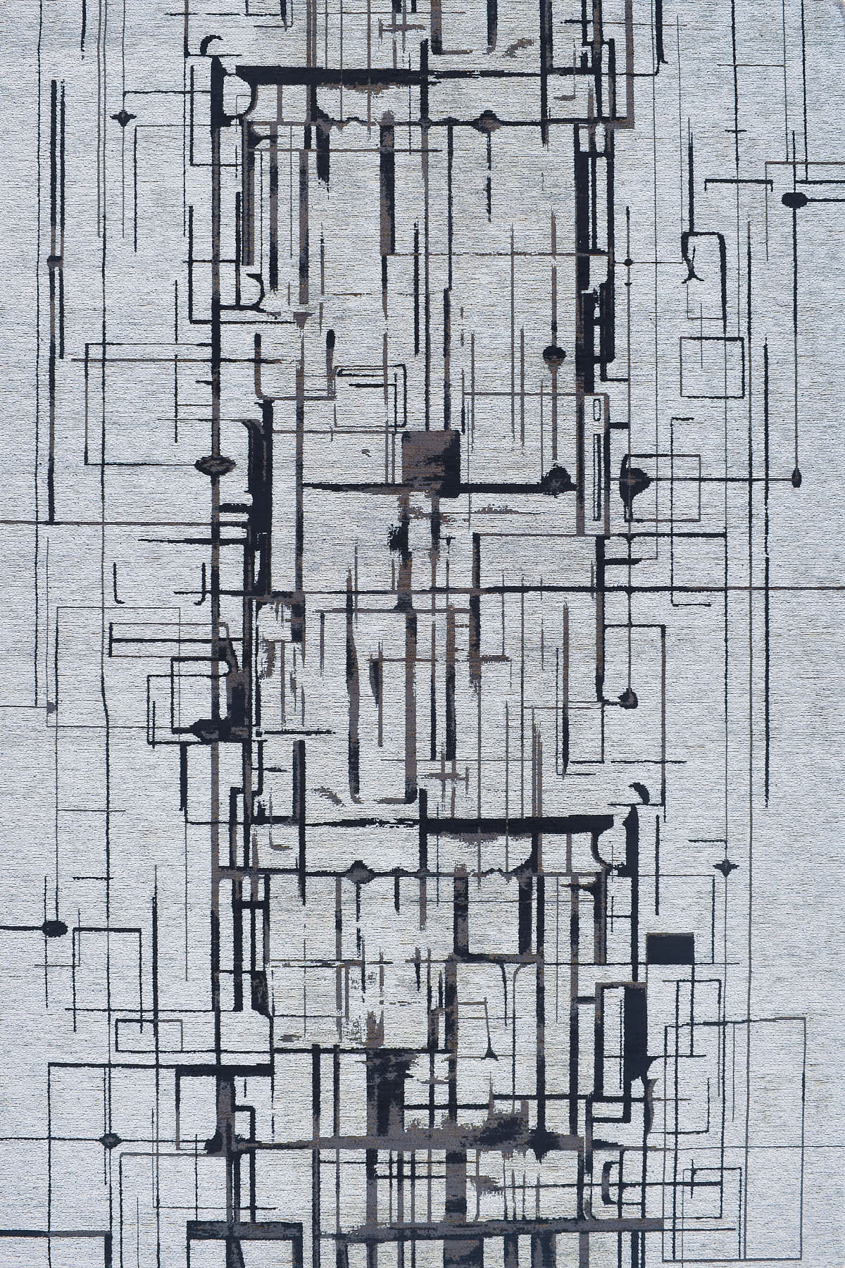 שטיח מנילה מהמם בעיצוב מודרני מכני של קווים מובילים וצורות משופשפות במראה תעשייתי מעוצב.