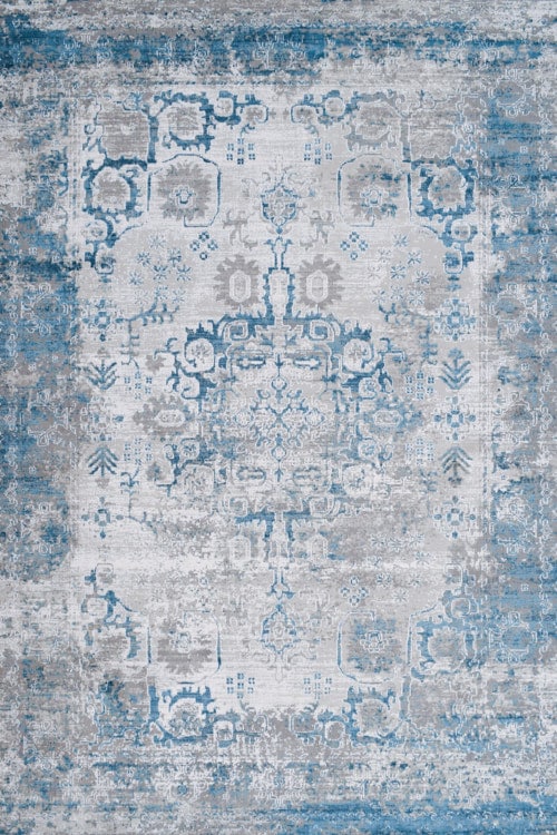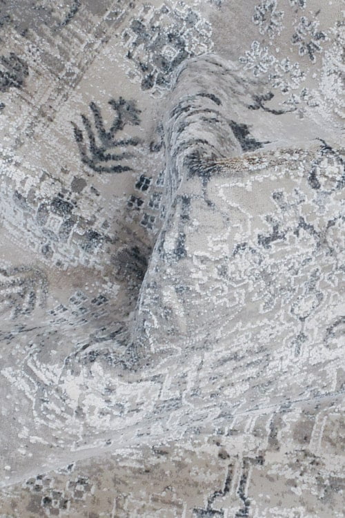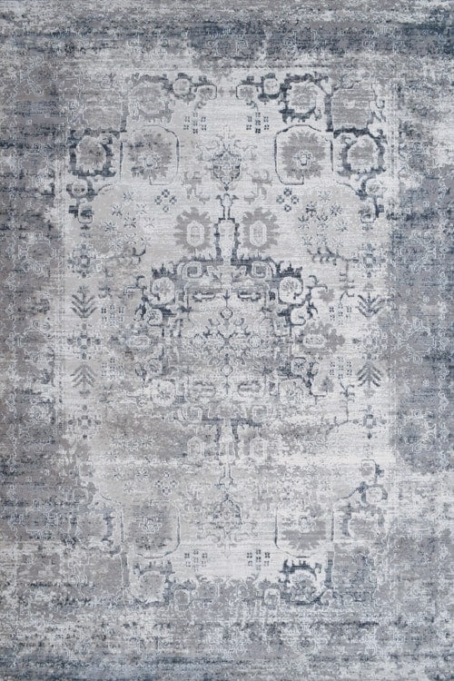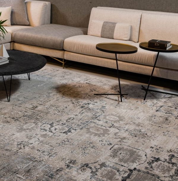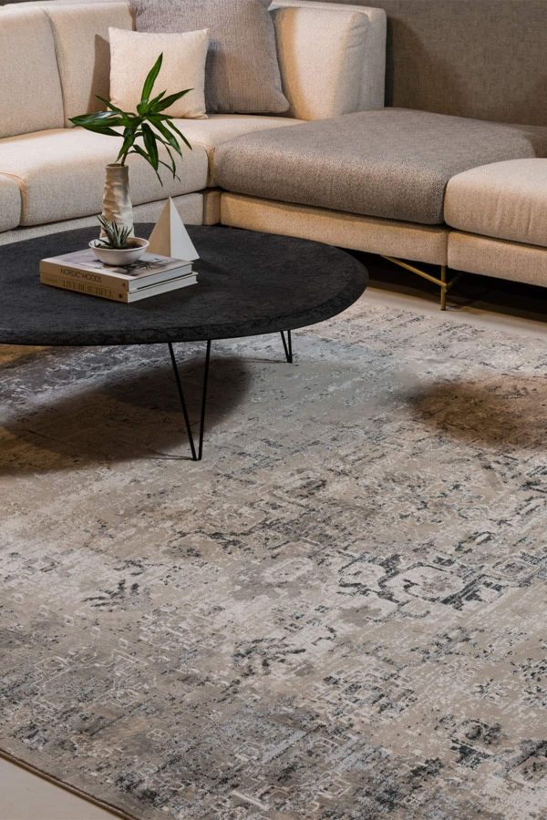 שטיח מהמם במדגם סטורי, בעל דוגמאות קלאסיות משופשפות לסירוגין, בגווני אפור אחידים שיתאימו לכל פלטת צבעים שתבחררו לחלל.