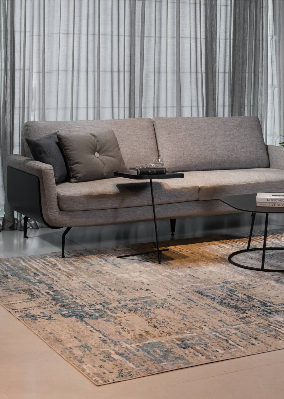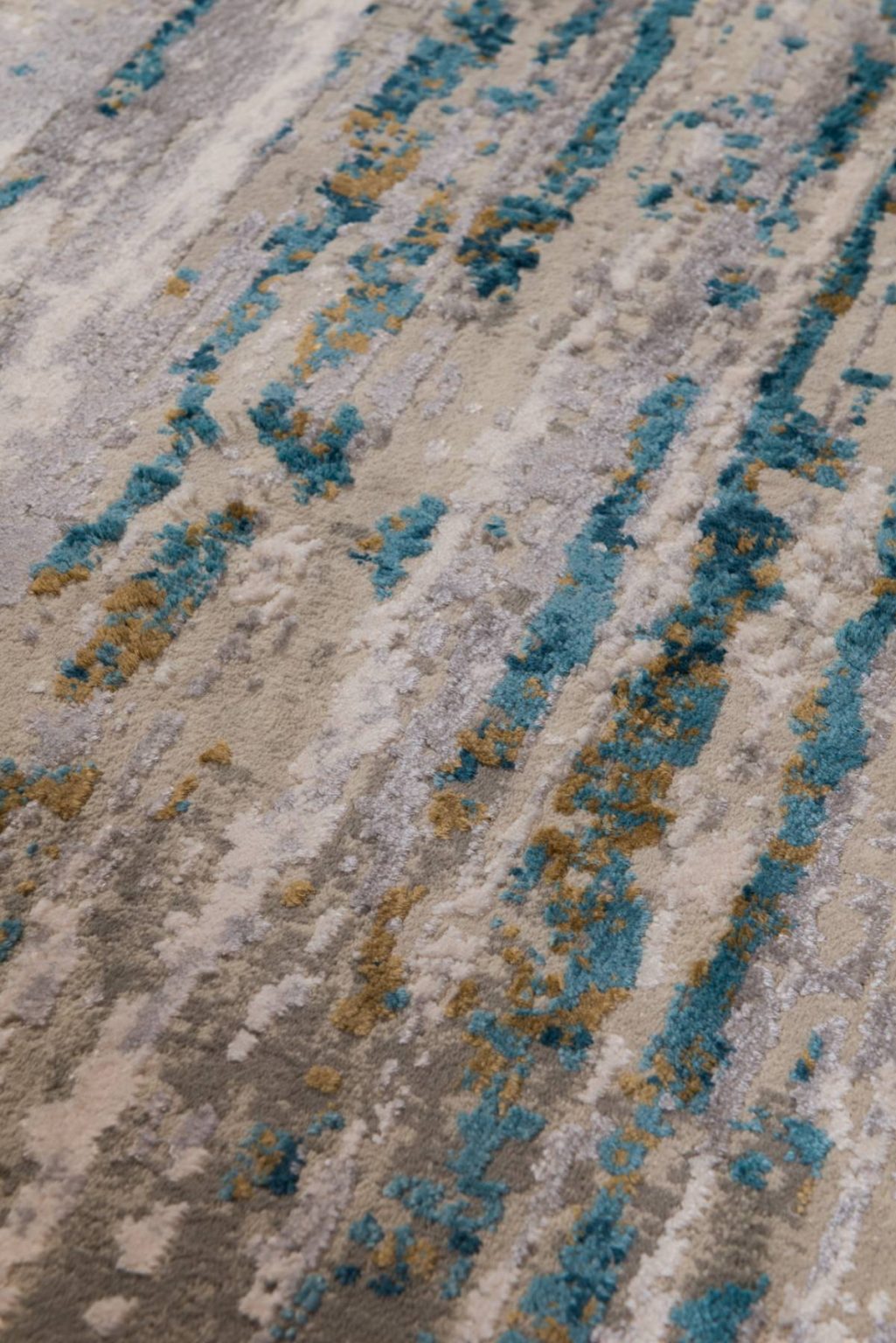 שטיח סטורי בסגנון מודרני בדוגמא מופשטת וטרנדית במיוחד, העשוי סיבי פוליאסטר בשילוב חוטי ויסקוזה הנארגים במכונה בטכניקה מדוקדקת.