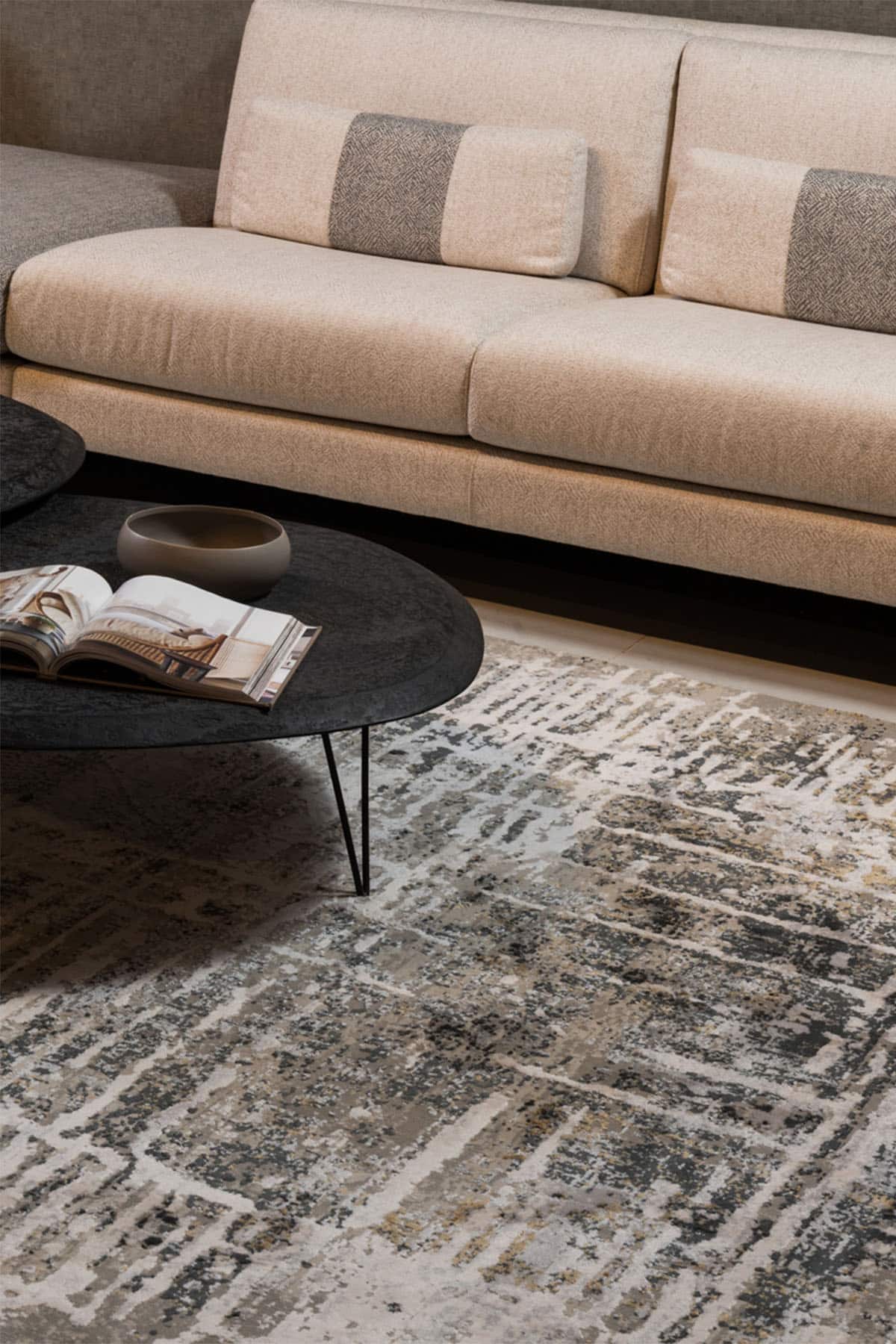 שטיח ססגוני אפור וחום בצבעוניות שקטה והרמונית.