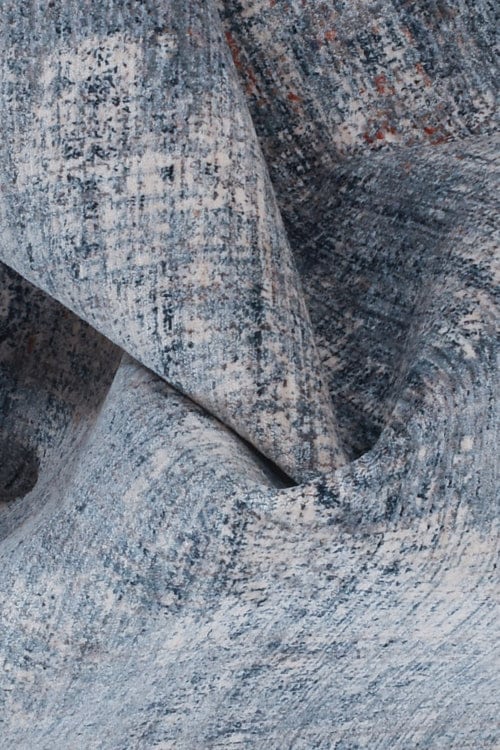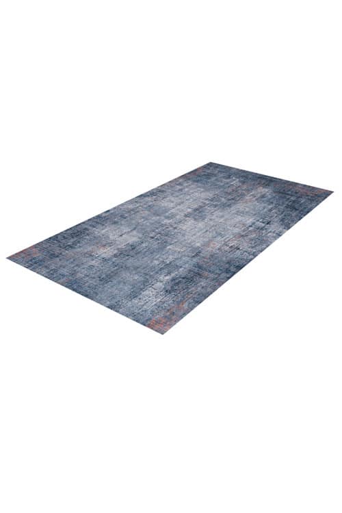 שטיח מהמם מקולקציית הסיטי, בטקסטורה עשירה של גווני כחול, אפור, שחור עם זריקות צבע אדמדם רנדומליות לאורכו של השטיח.