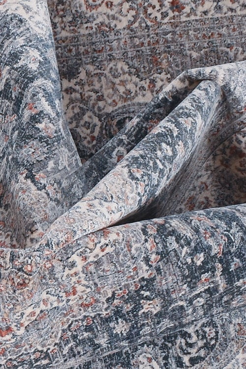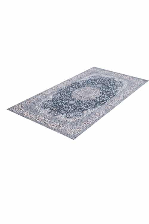 השטיח מיוצר באסיה, ועשוי 100% סיבי פוליאסטר הנארגים במכונה, בגווני כחול שקטים על רקע בהיר, עם מספר נגיעות מיוחד של גוון וורדרד.