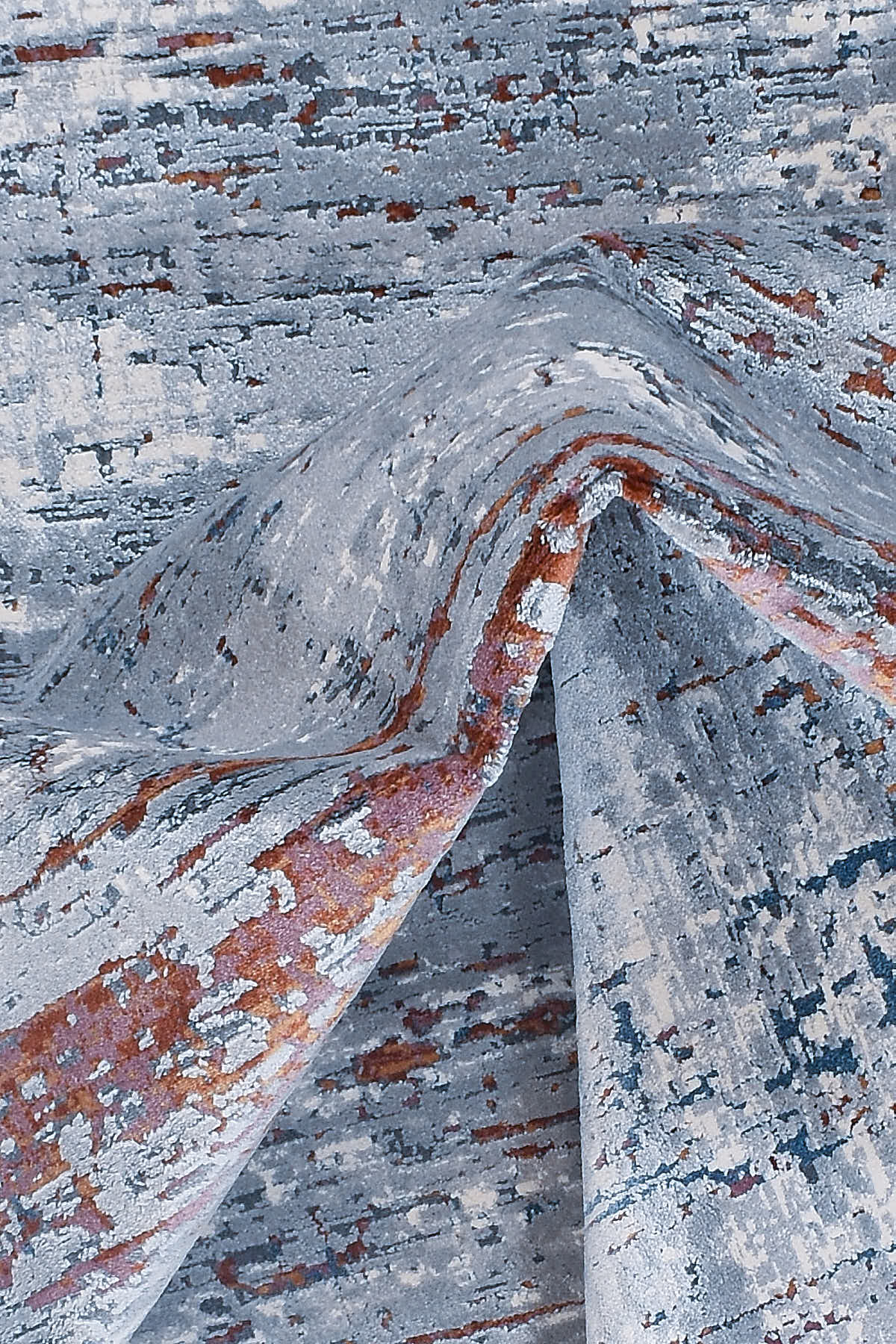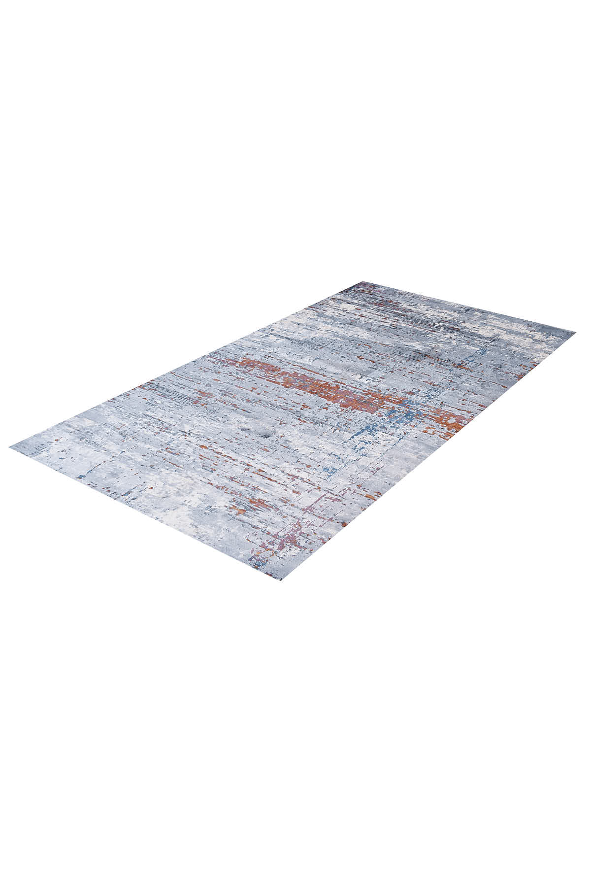 שטיח גאיה מתחדש בסגנון מודרני מרהיב, המשלב גווני אדום וכחול כהה על בסיס אפור ניטרלי בדמות חוטי פוליאסטר ופוליפרופילן הנארגים בצפיפות גבוהה בעבודת מכונה מדויקת, הנעשית בטורקיה.