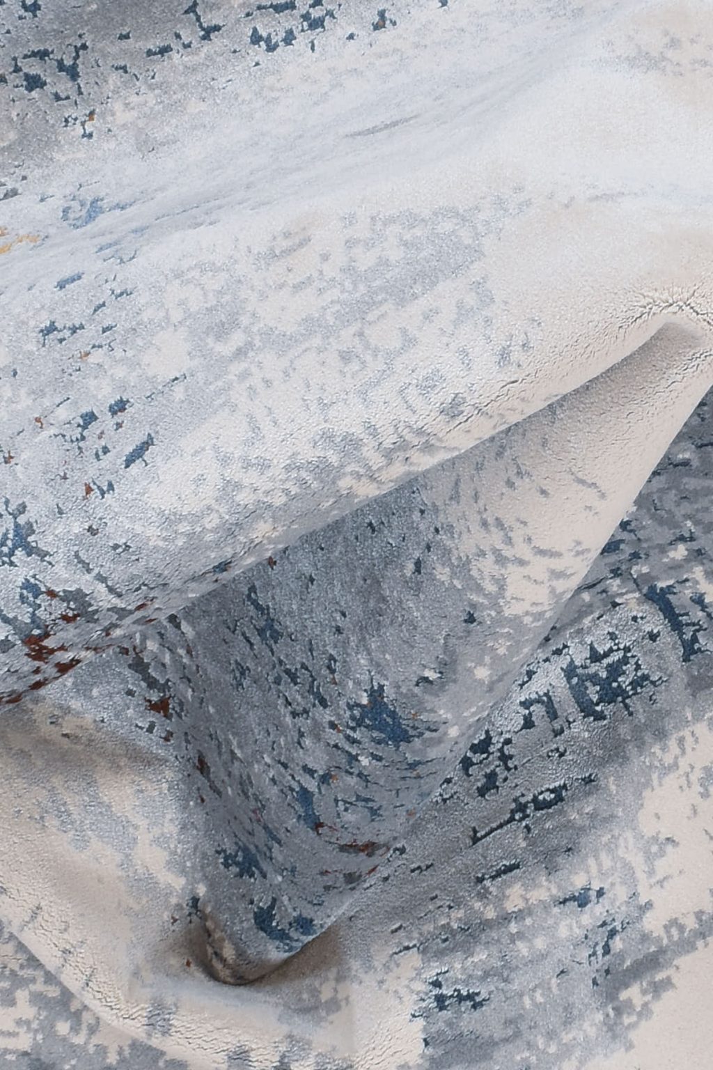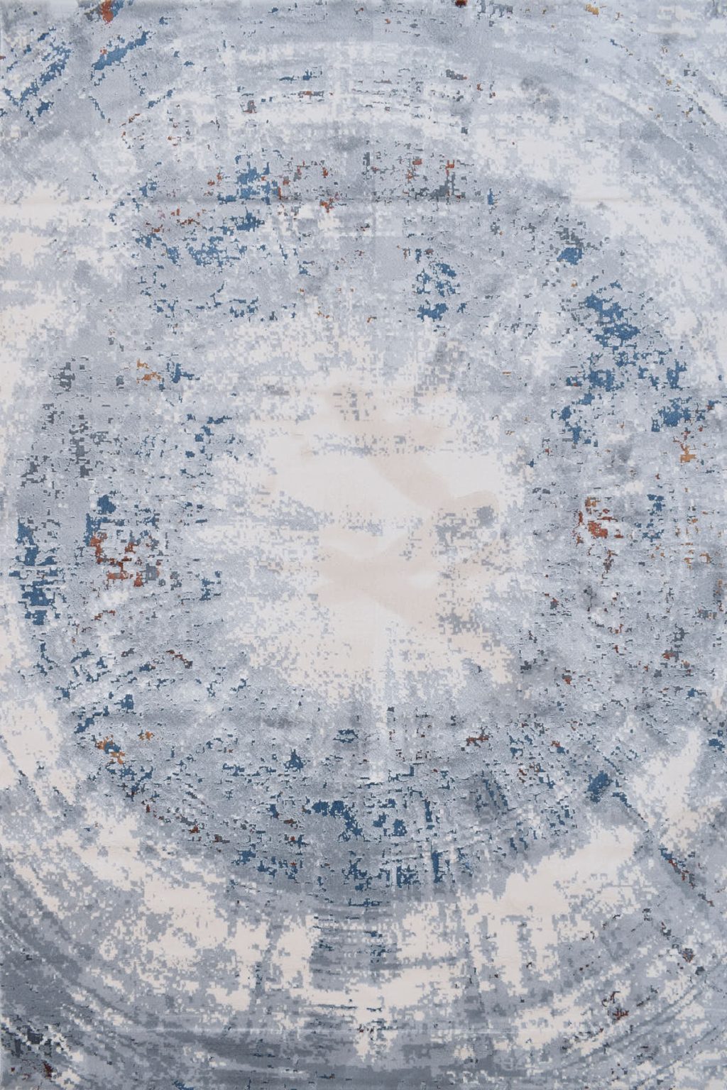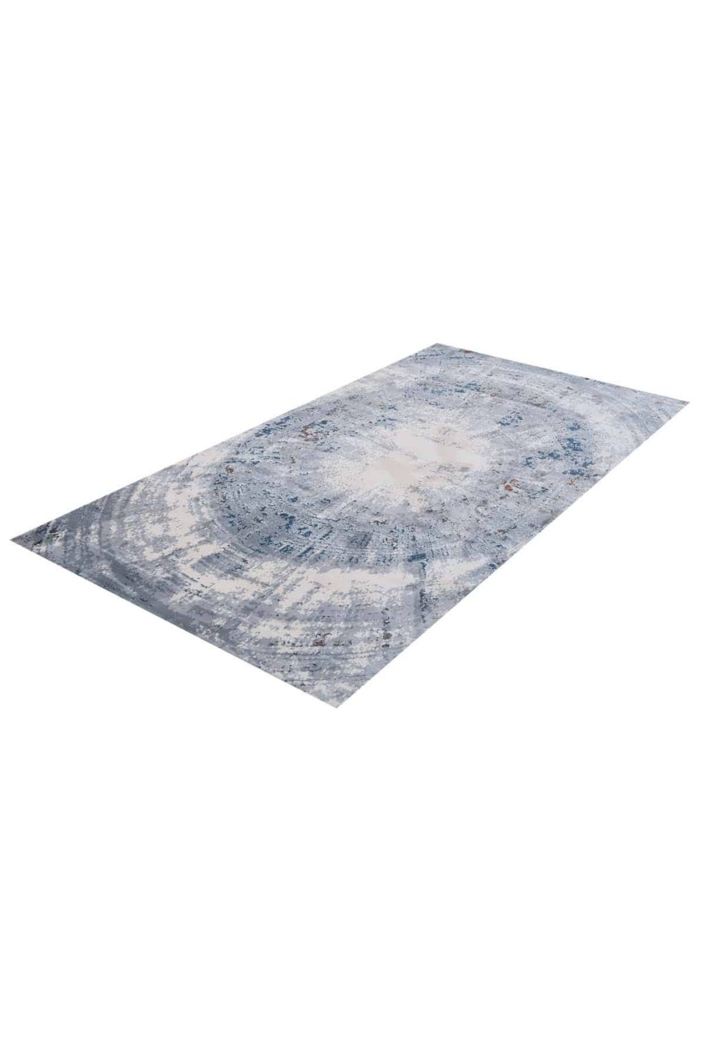 שטיח מושלם מדגם גאיה, בדוגמת עיגול משופשפת בגווני אפור בהיר, כחול וכסוף, הארוגים במכונה לכדי דוגמת עיגול