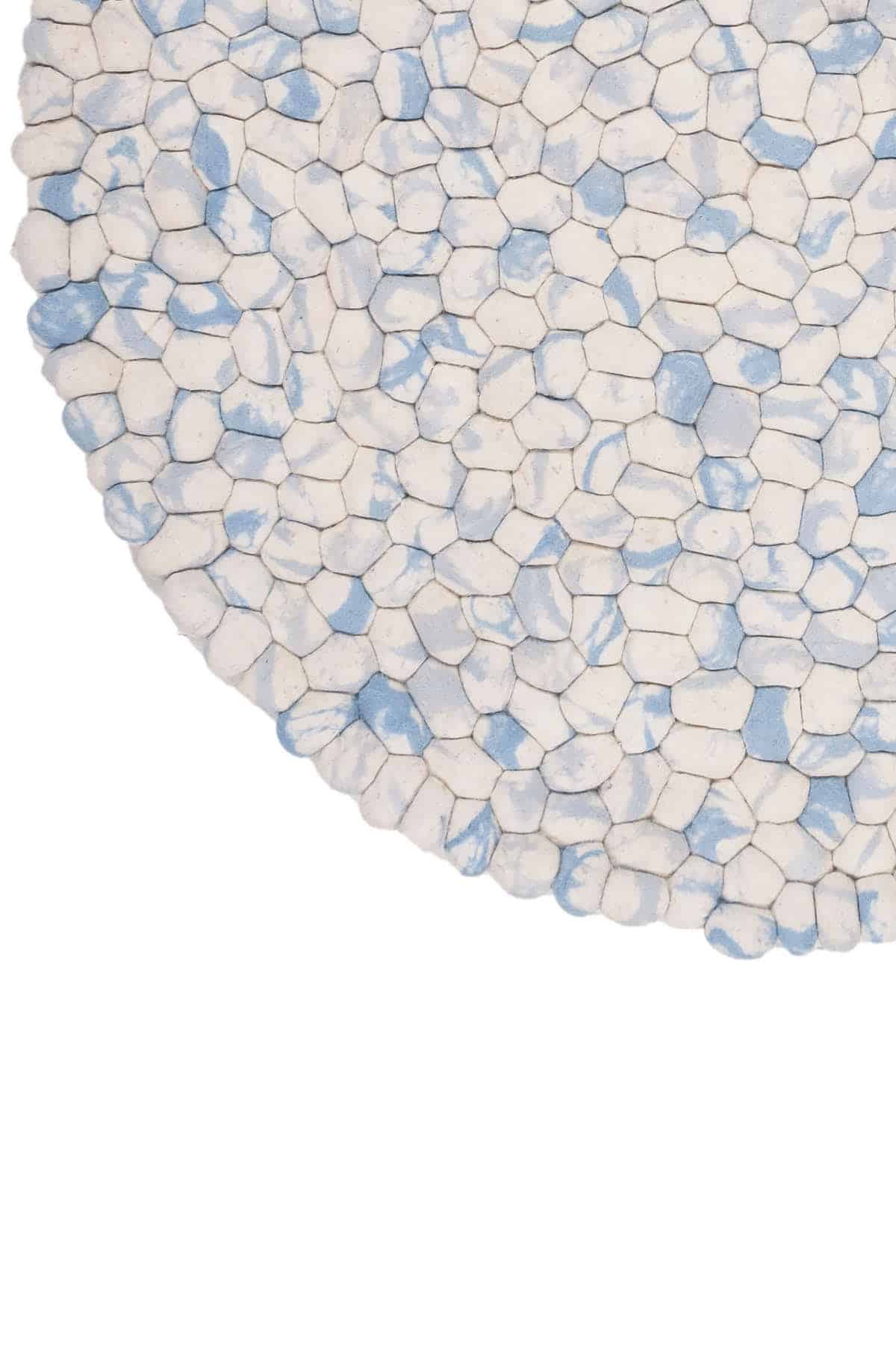 שטיח חלוקי נחל תכלת עגול בגווני תכלת ולבן, מתאים כשטיח לחדר ילדים , למשרד ועוד.