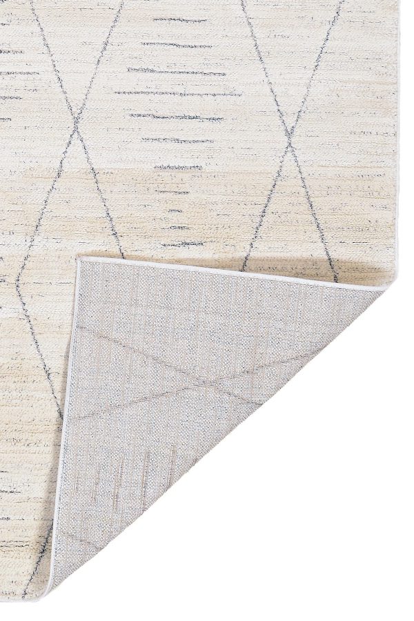 השטיח נארג במכונה ועשוי פוליאסטר בשילוב פוליפרופילן, בעל דוגמת מעויינים משולבת עם קווים