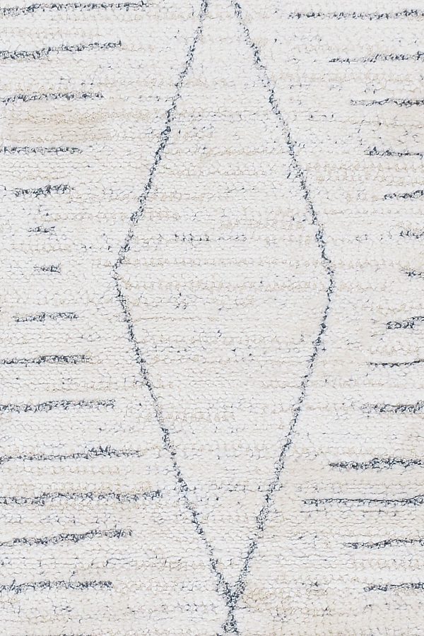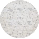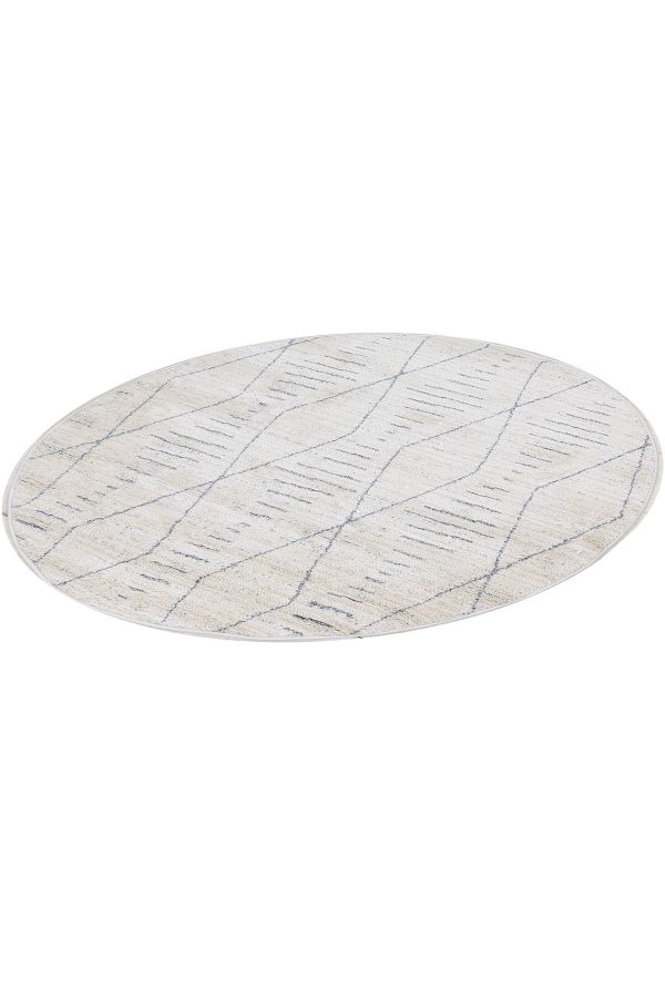 שטיח עגול לבן מקולקציית מאטיס החדשה, המשלב את דוגמאת מעויינים האתנית עם קווים מקבילים בסגנון הנורדי מנצח.