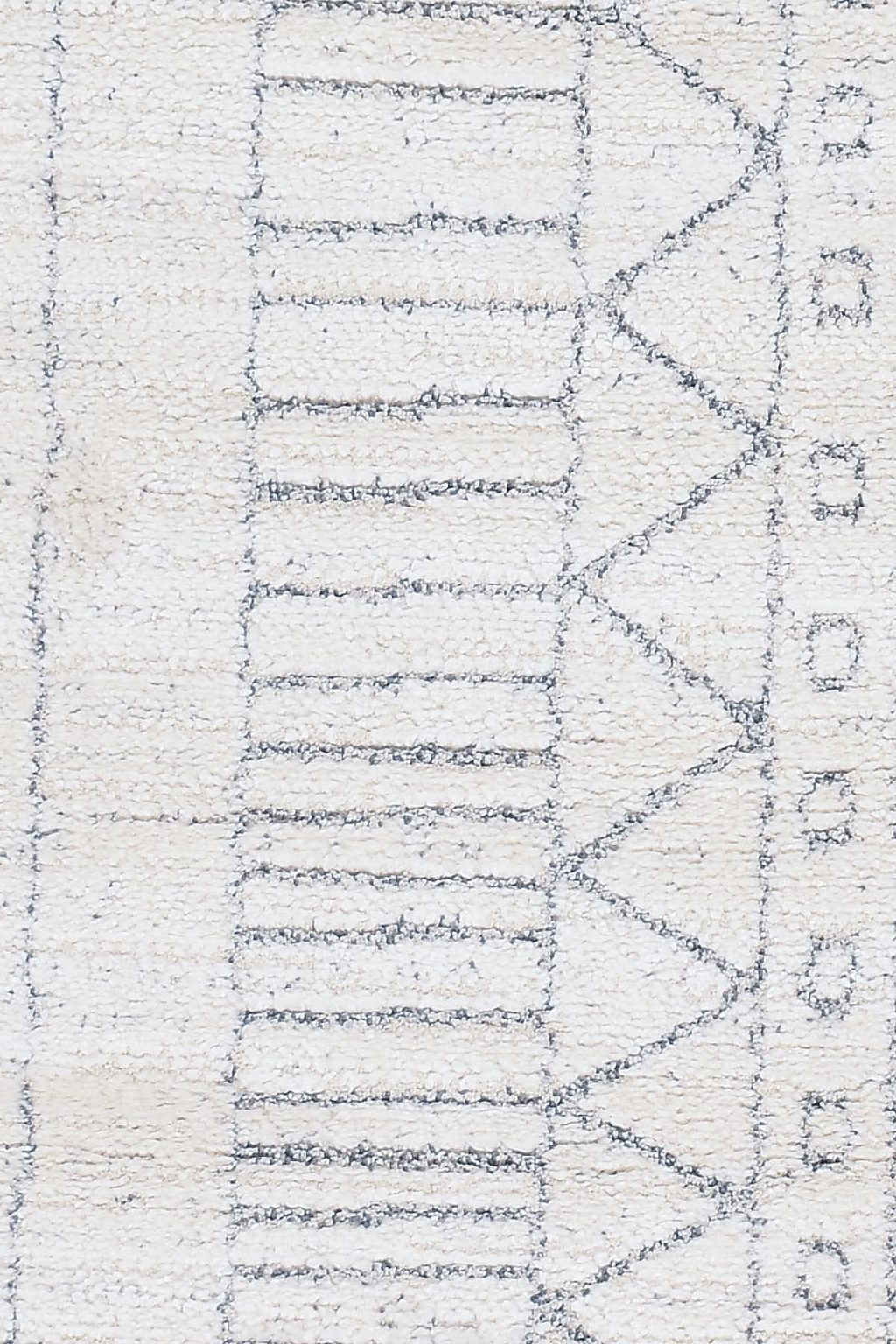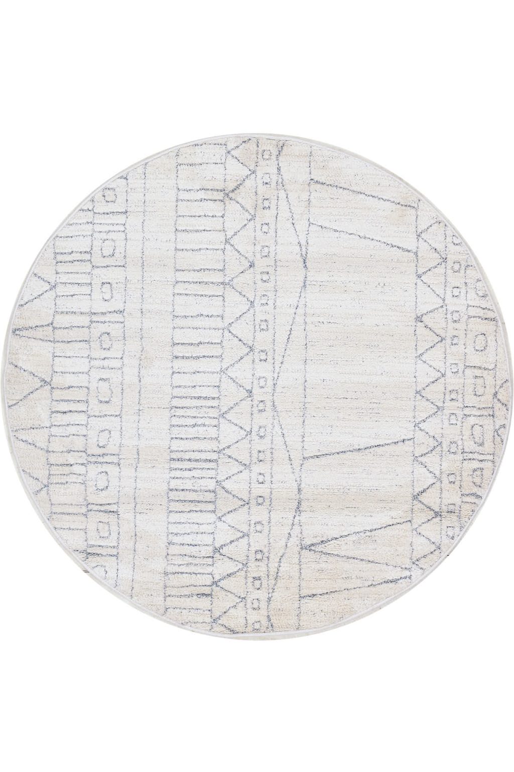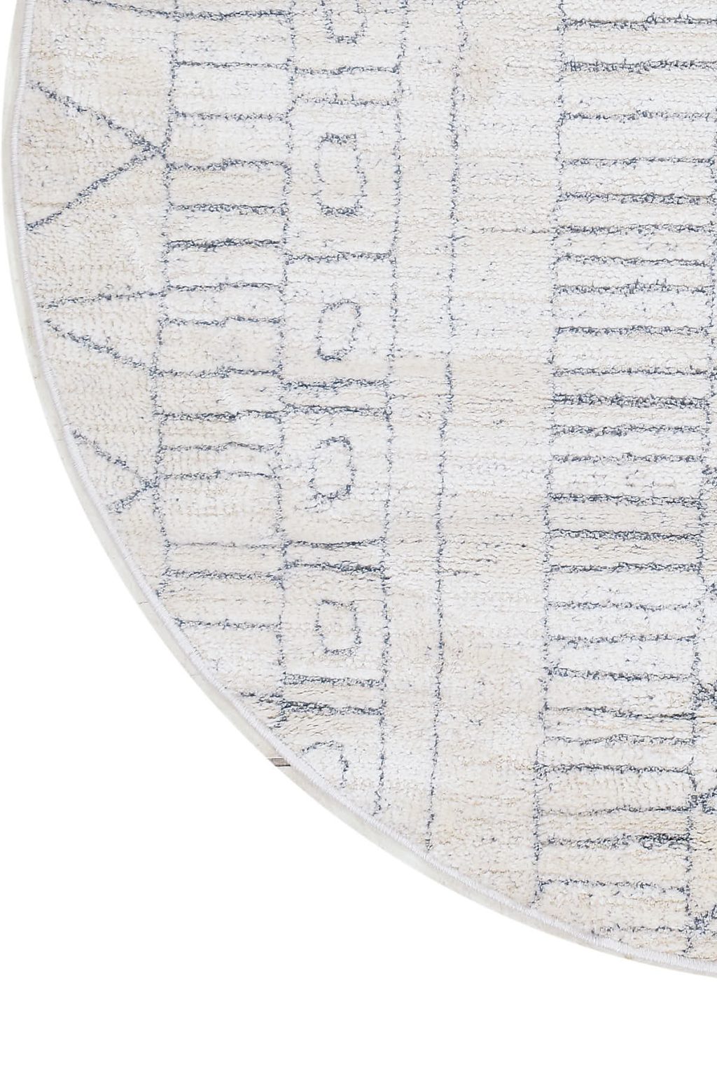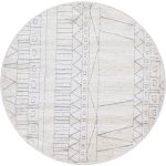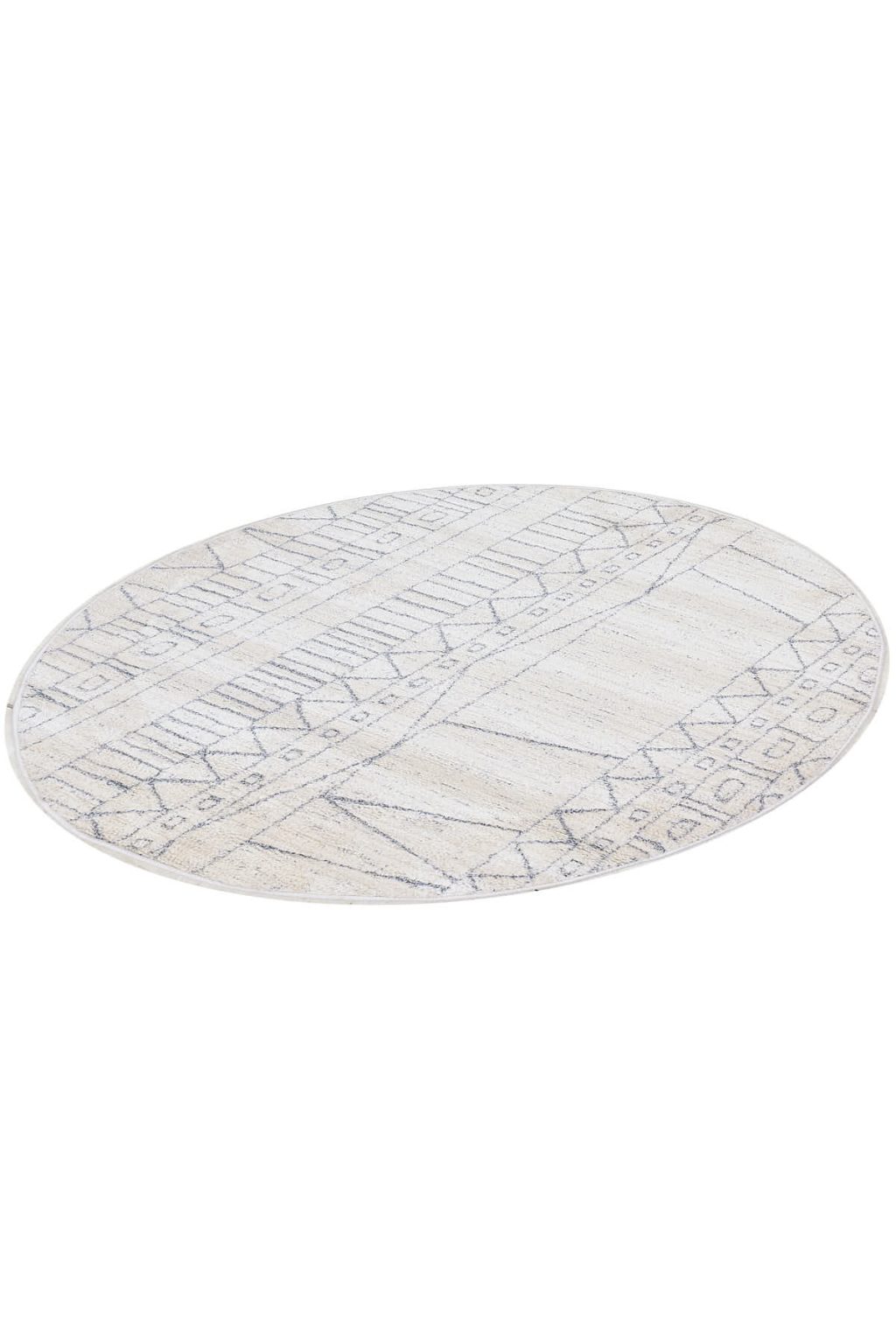 שטיח עגול מקולקציית מאטיס, בצבע לבן עם דוגמא מודרנית מופשטת בדמות נגיעות אפורות רכות, הנוצרות ע״י חיבור חכם של פוליאסטר עם סיבי פוליפרופילן הארוג בעבודת מכונה מדויקת.