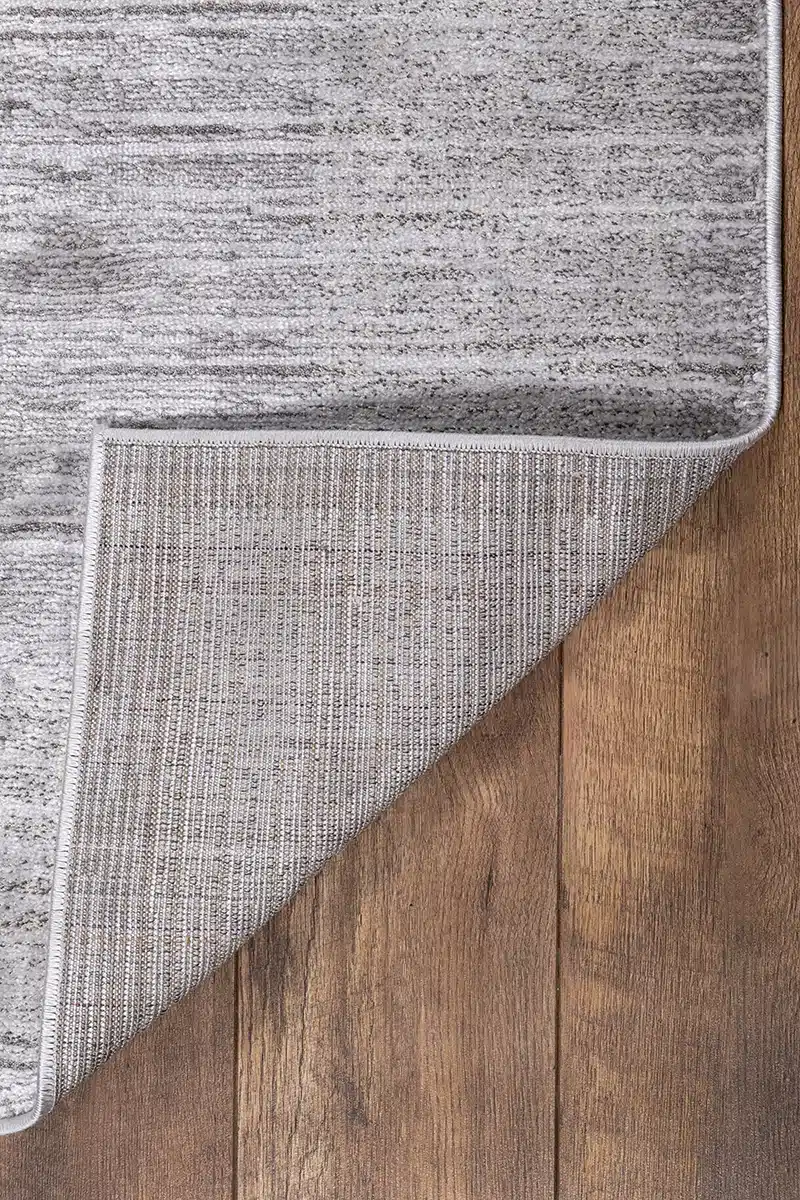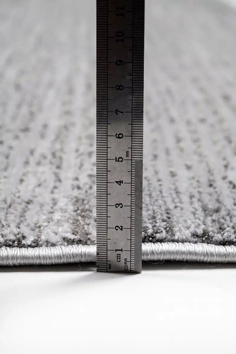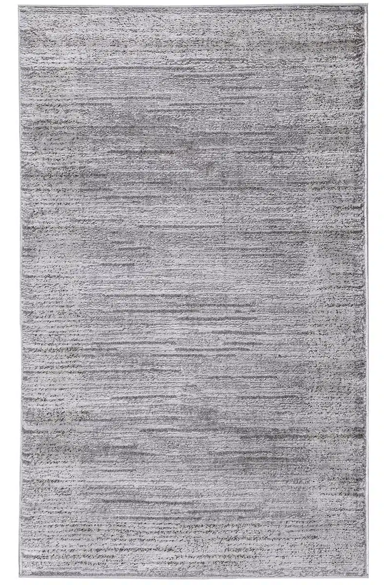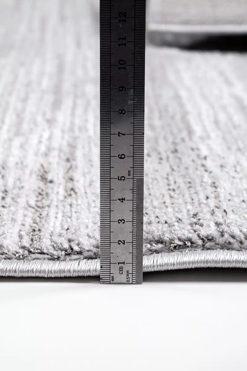שטיח לחדר שינה בגוון אפור לבן, המעוצב בסגנון מודרני בעל דוגמא משופשפת מעודנת הארוגה לאורך השטיח.