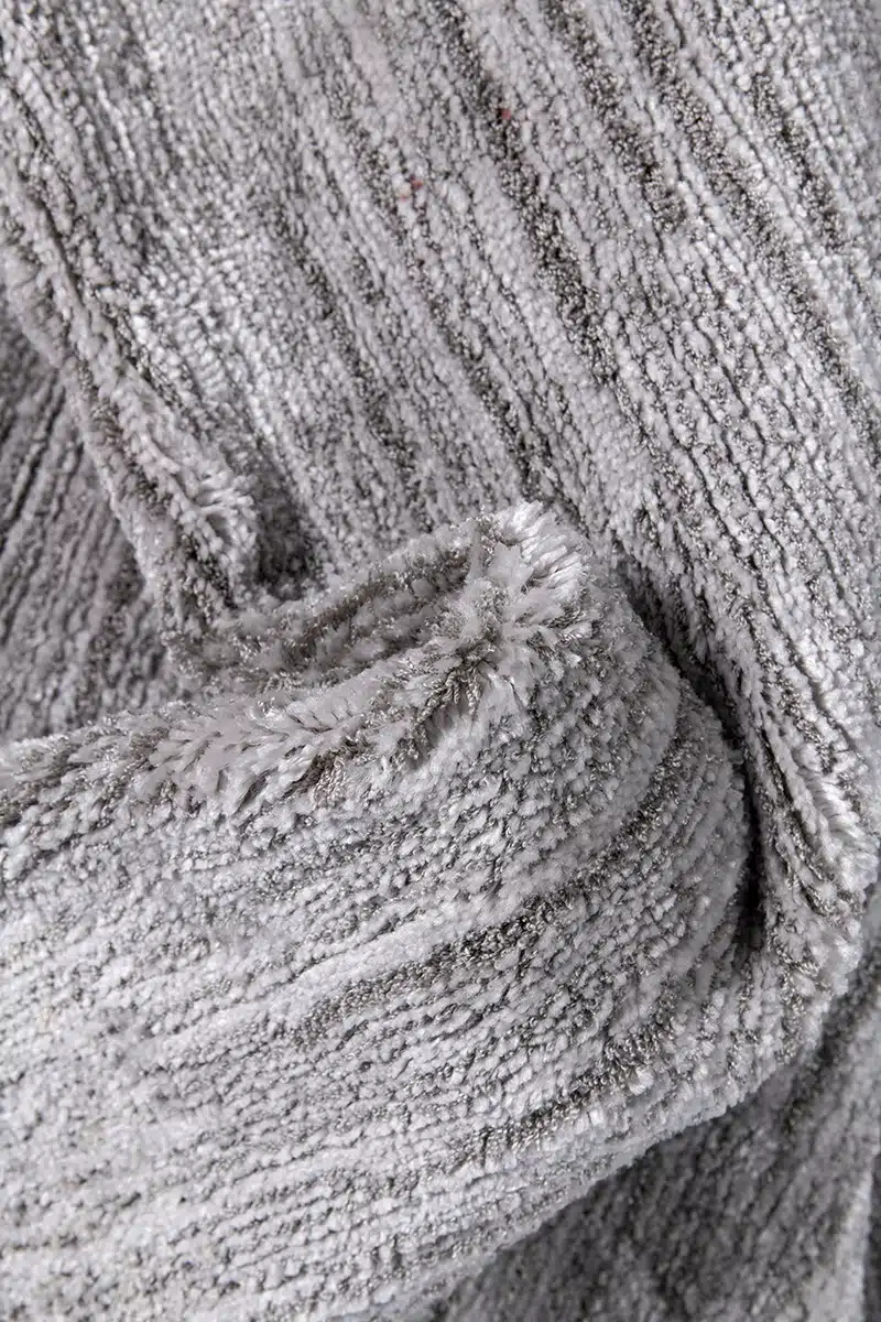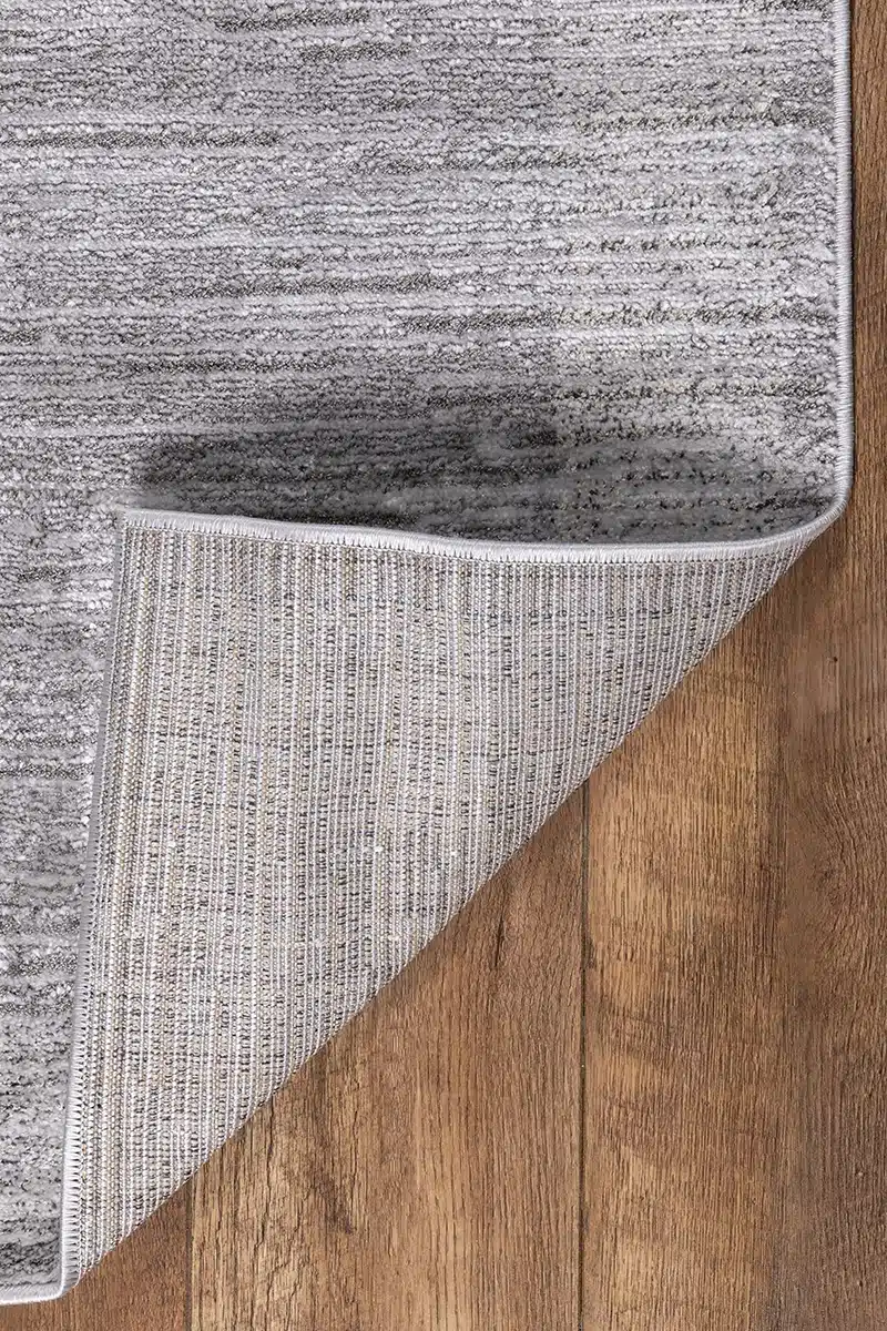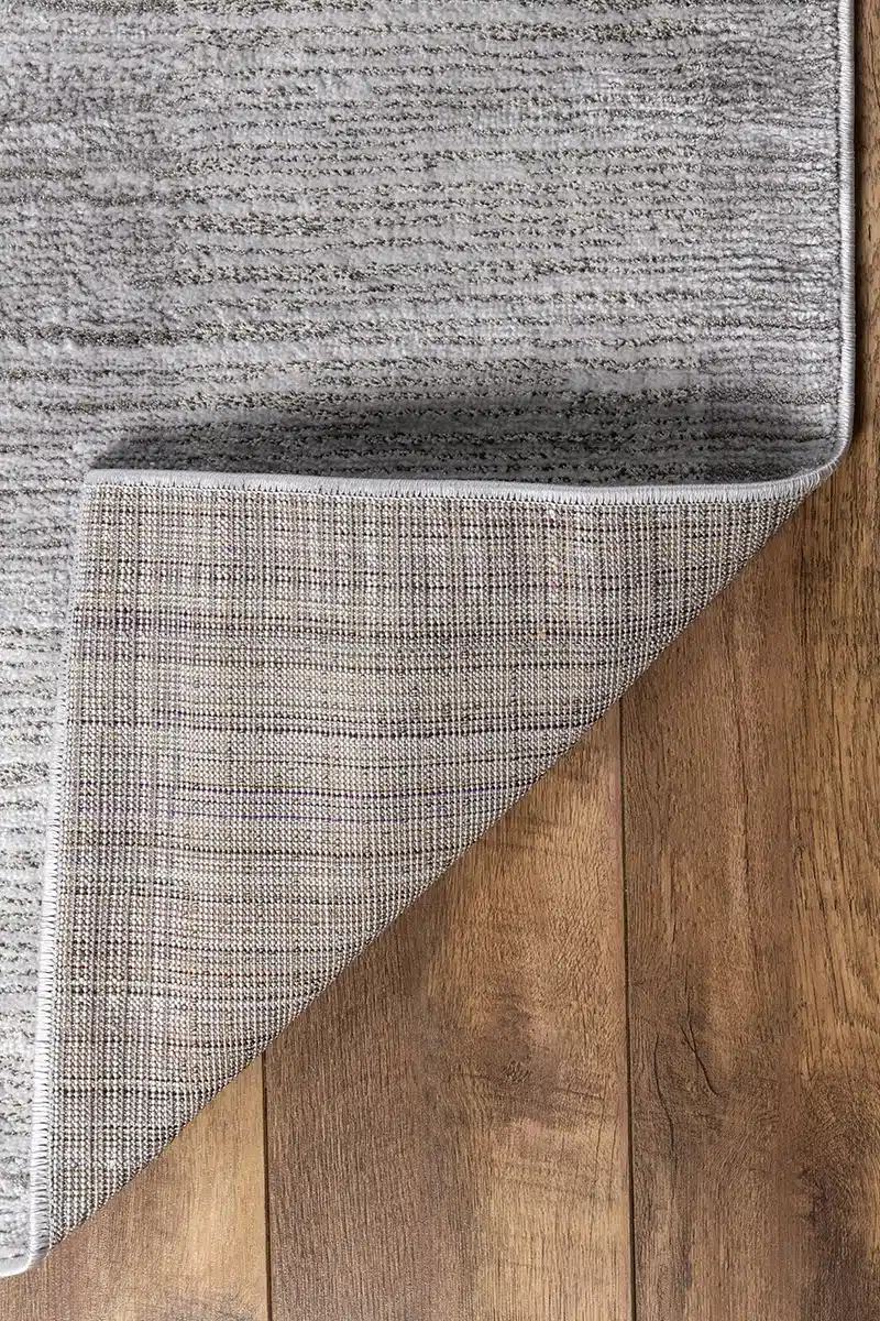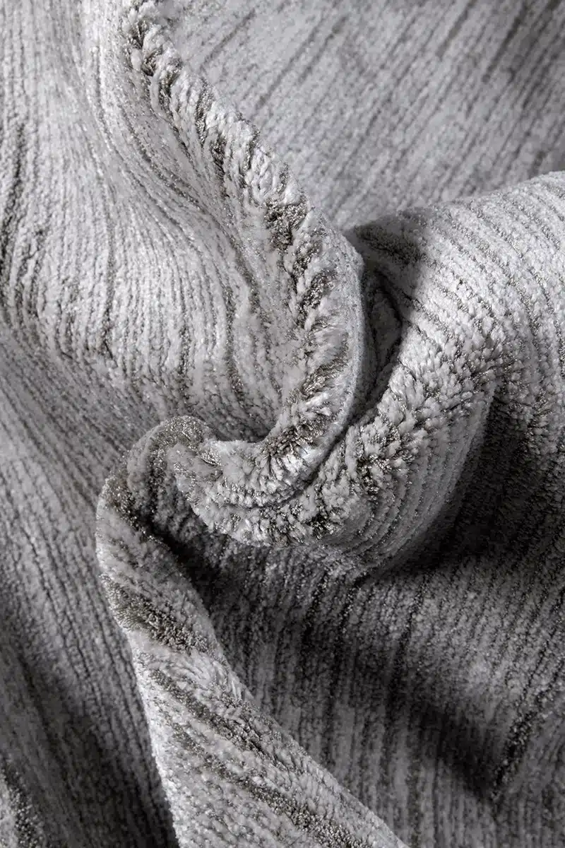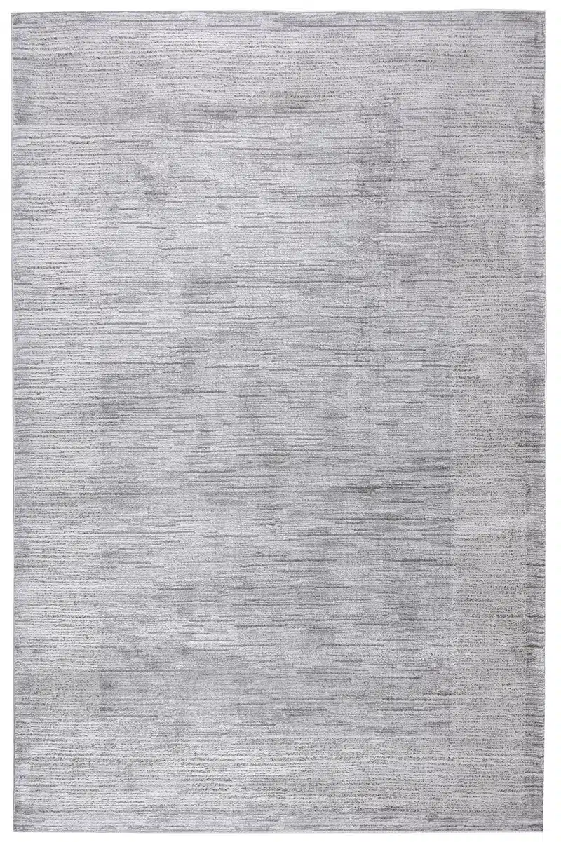שטיח לחדר שינה בגוון אפור לבן, המעוצב בסגנון מודרני בעל דוגמא משופשפת מעודנת הארוגה לאורך השטיח.