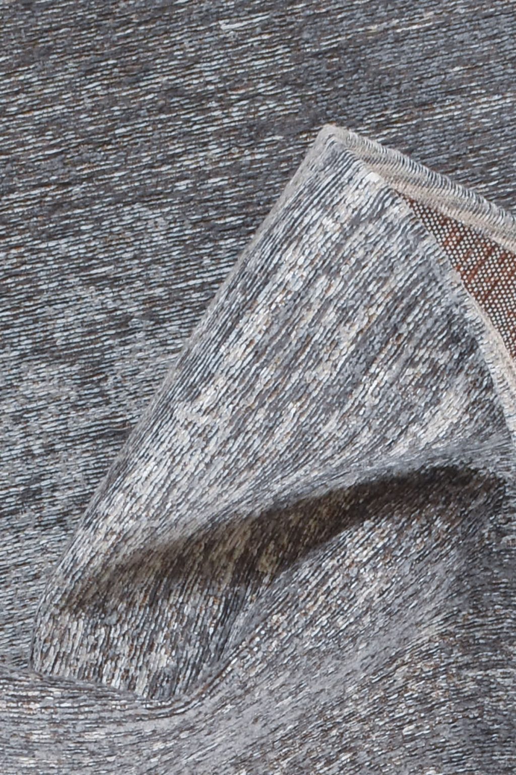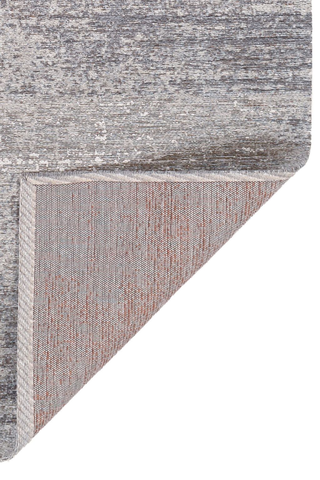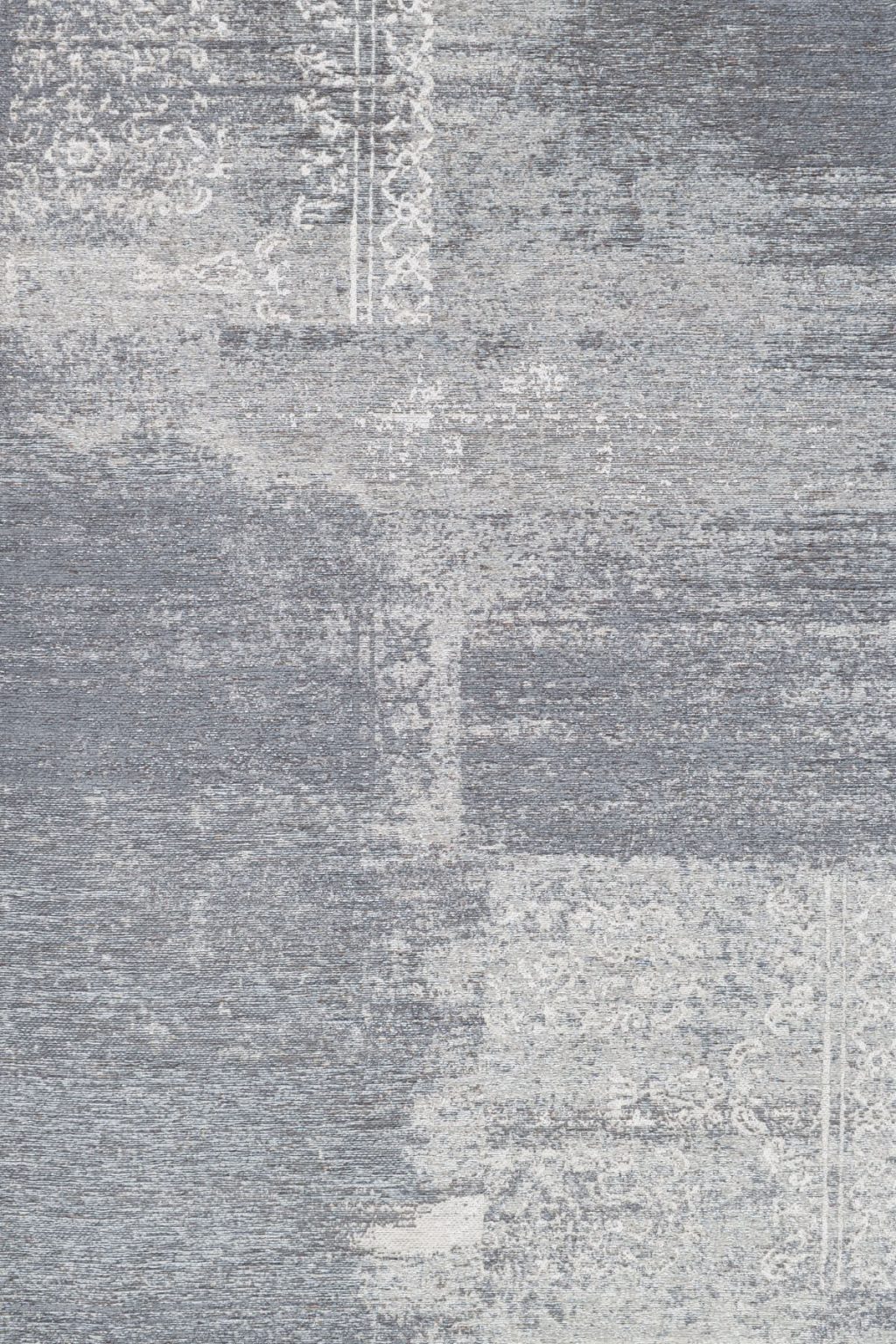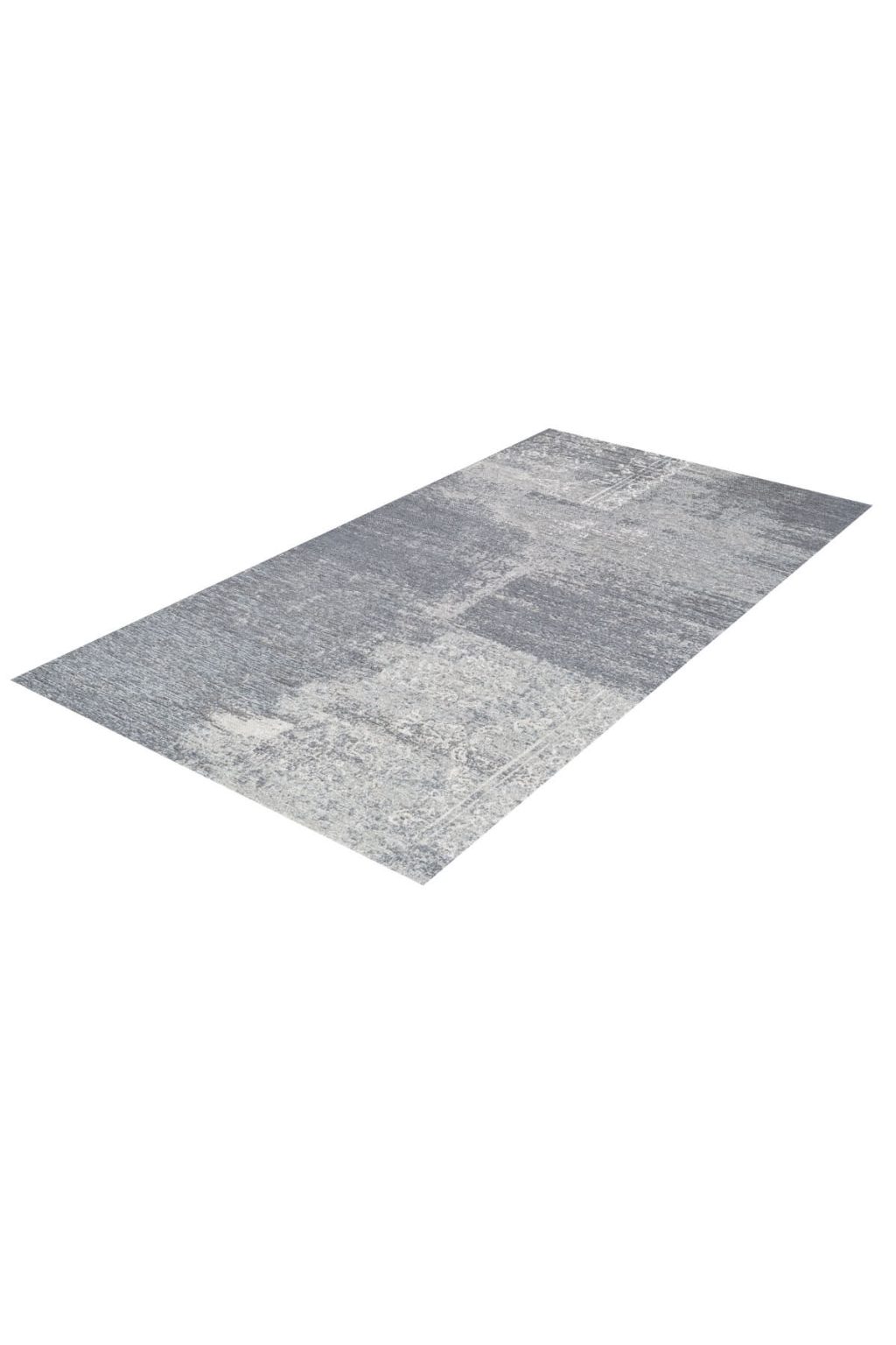 שטיח מושלם לסלון מקולקציית מנילה במראה משופשף טרנדי, בגווני אפור בהיר וכהה, כאשר מבעד לסיבים, ניתן להבחין בדוגמא קלאסית נסתרת לבנה.