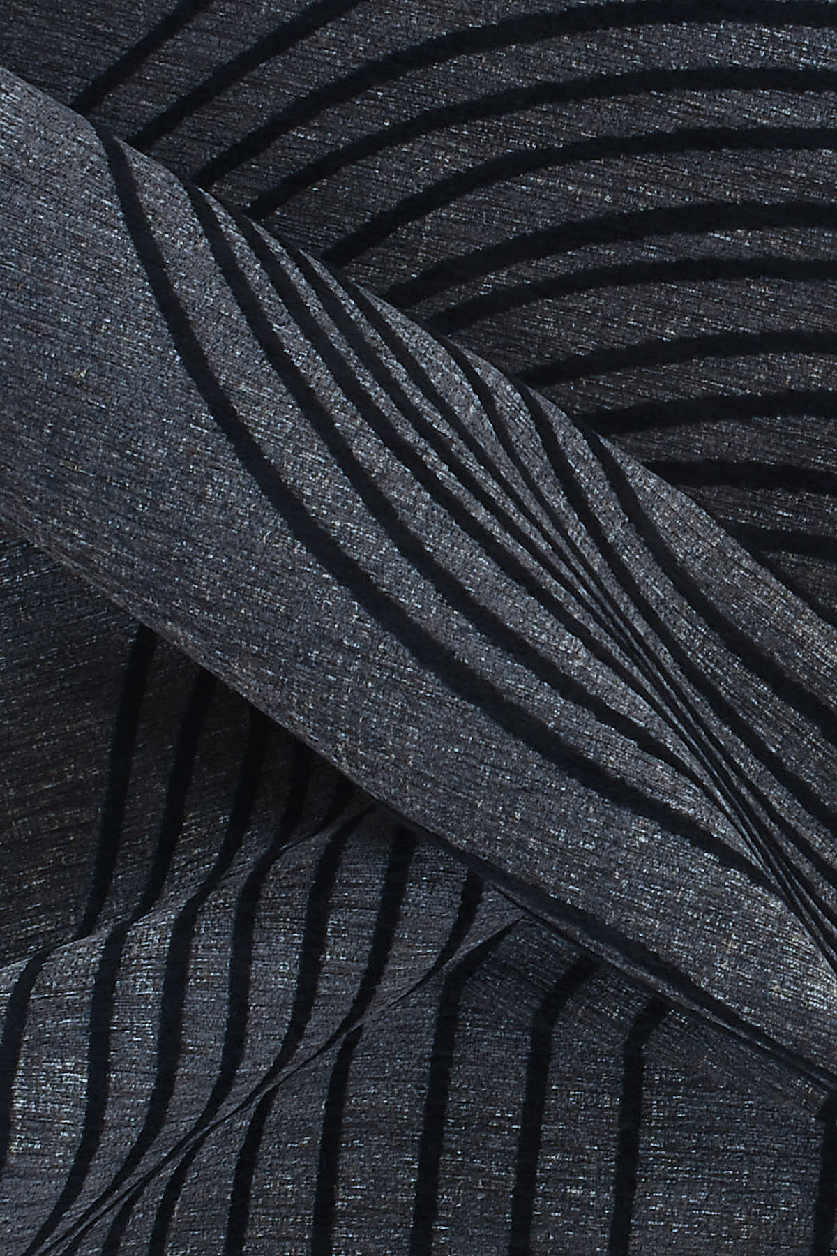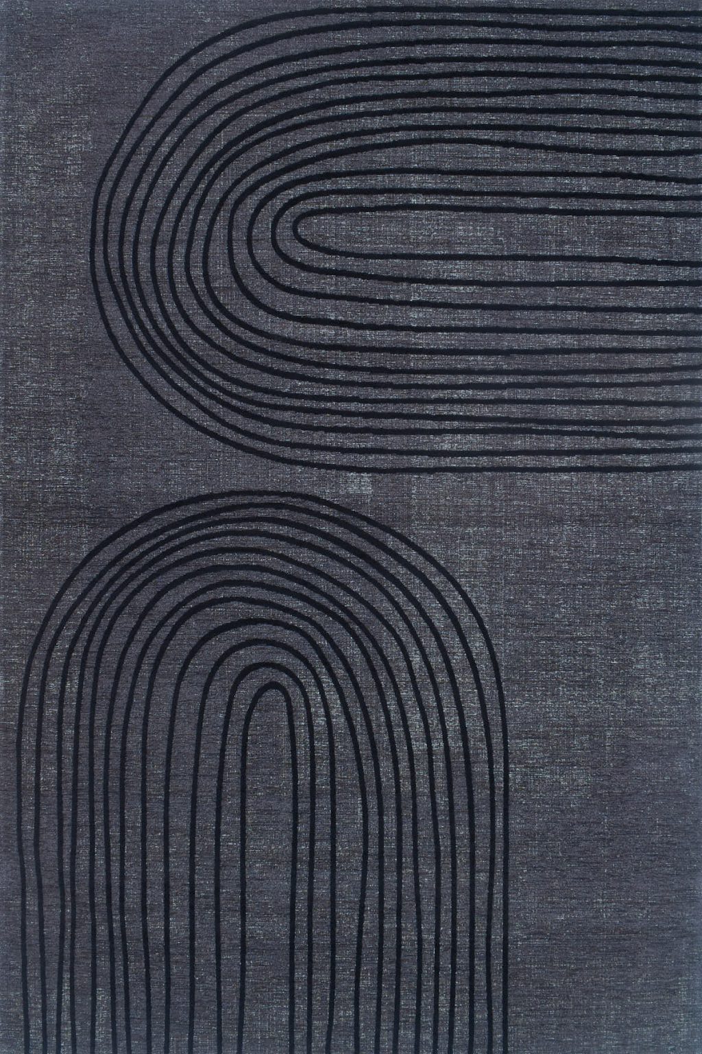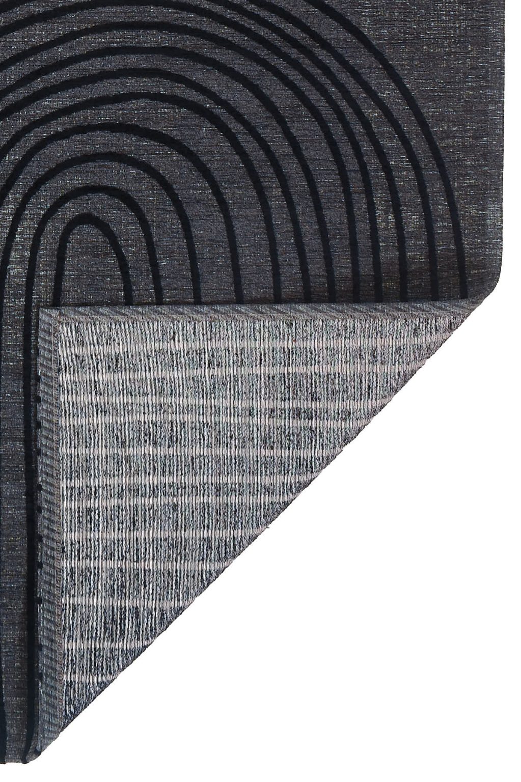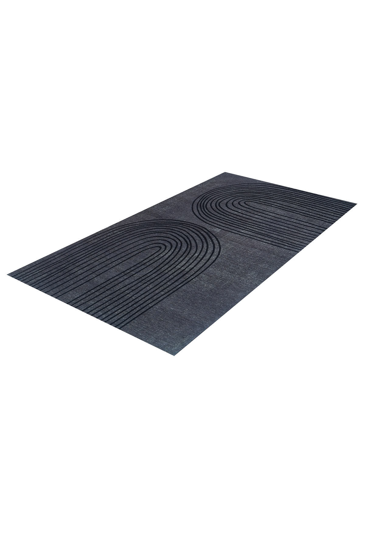 שטיח מנילה בעיצוב אתני וסופר טרנדי של קשתות שחורות על רקע אפור כהה.