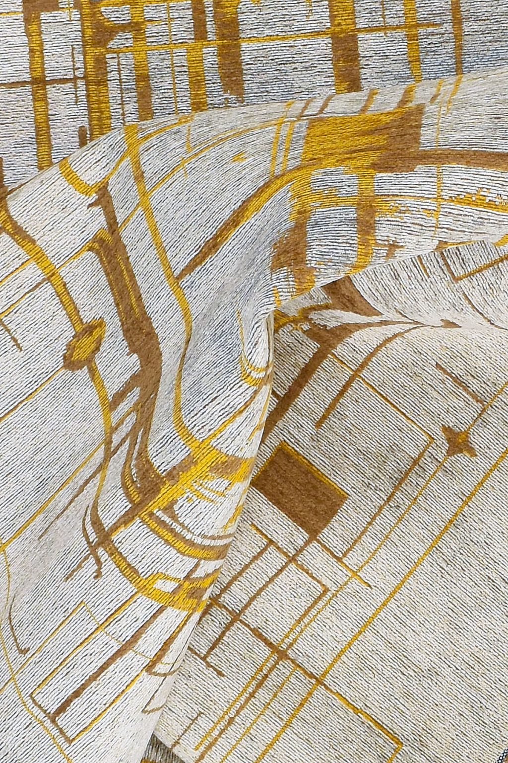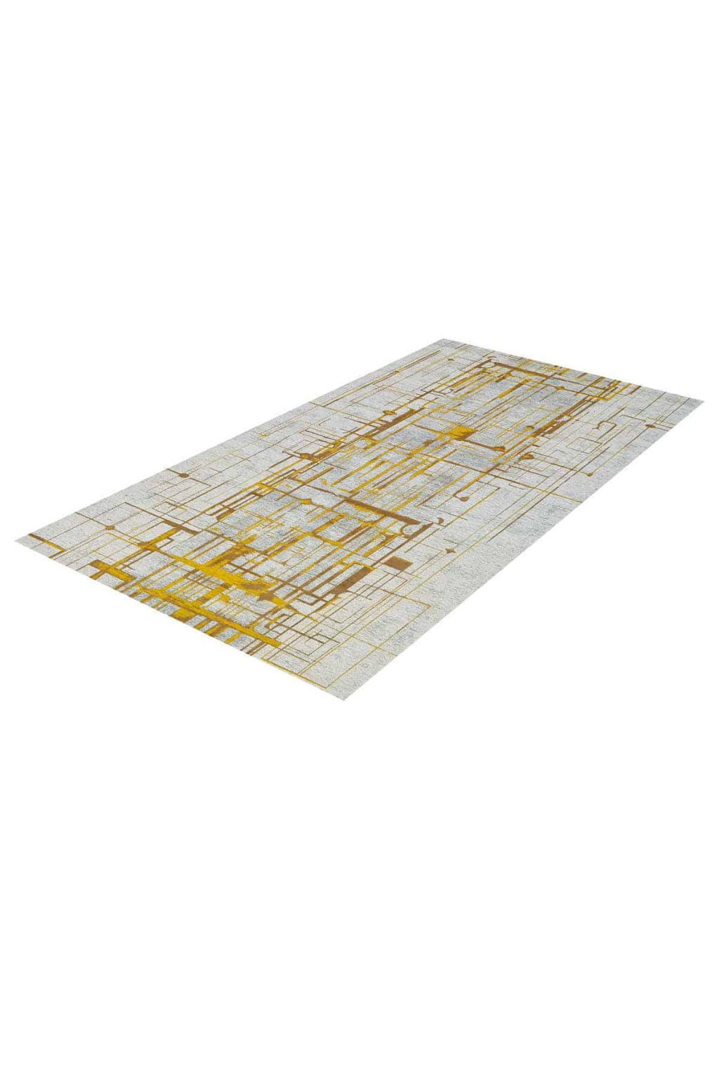 שטיח מדהים בעיצוב מודרני תעשייתי עם דוגמא מכנית של קווים ונקודות, כאשר הדוגמא נארגת בצבעי זהב מלכותי בשני גוונים שונים.