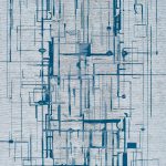 שטיח מטריף מקולקציית מנילה, עם בסיס אפור בהיר בשילוב דוגמא מכנית של קווים ונקודות, כאשר הדוגמא נארגת בגוון כחול בגימור מבריק ומדויק.