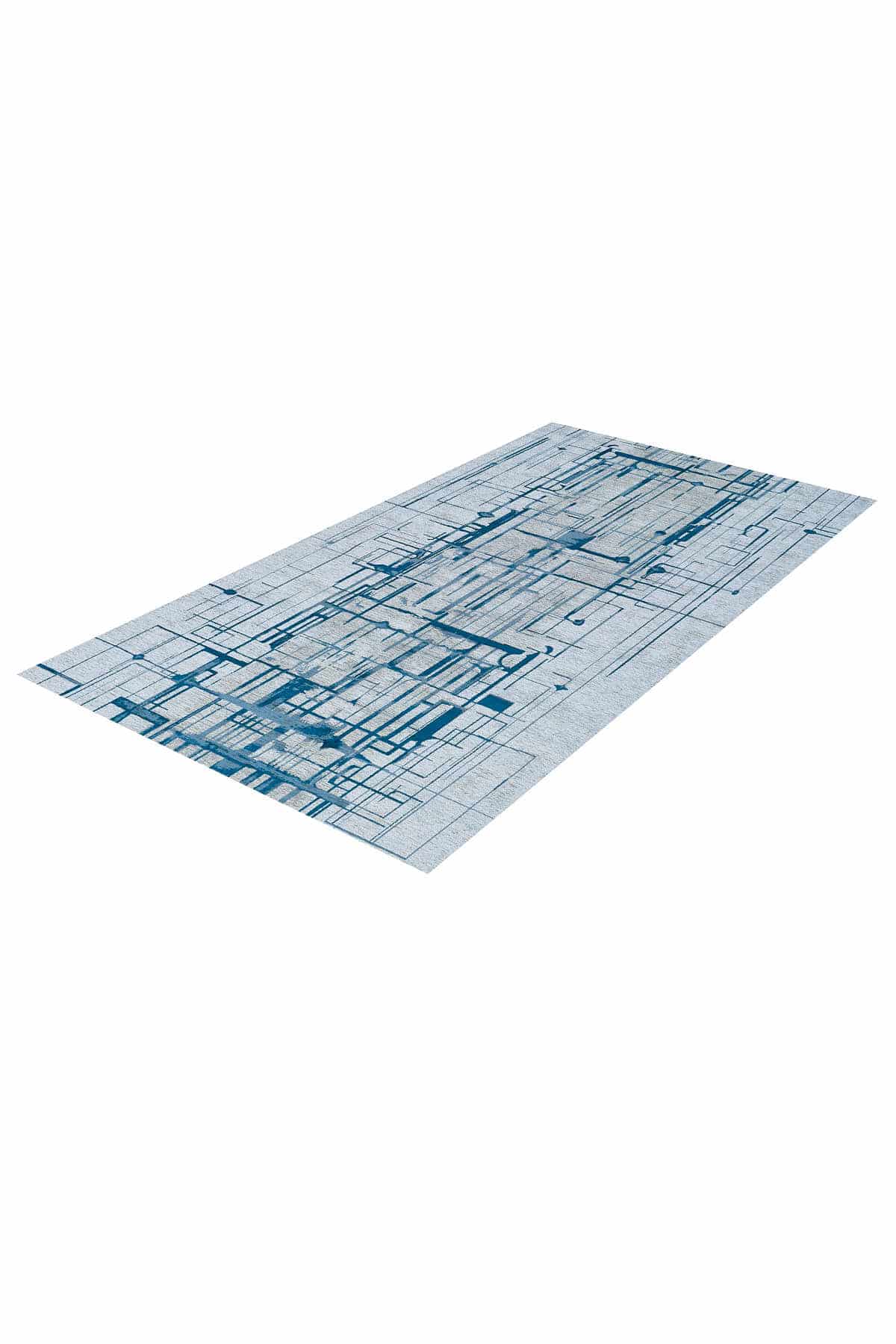 שטיח מטריף מקולקציית מנילה, עם בסיס אפור בהיר בשילוב דוגמא מכנית של קווים ונקודות, כאשר הדוגמא נארגת בגוון כחול בגימור מבריק ומדויק.