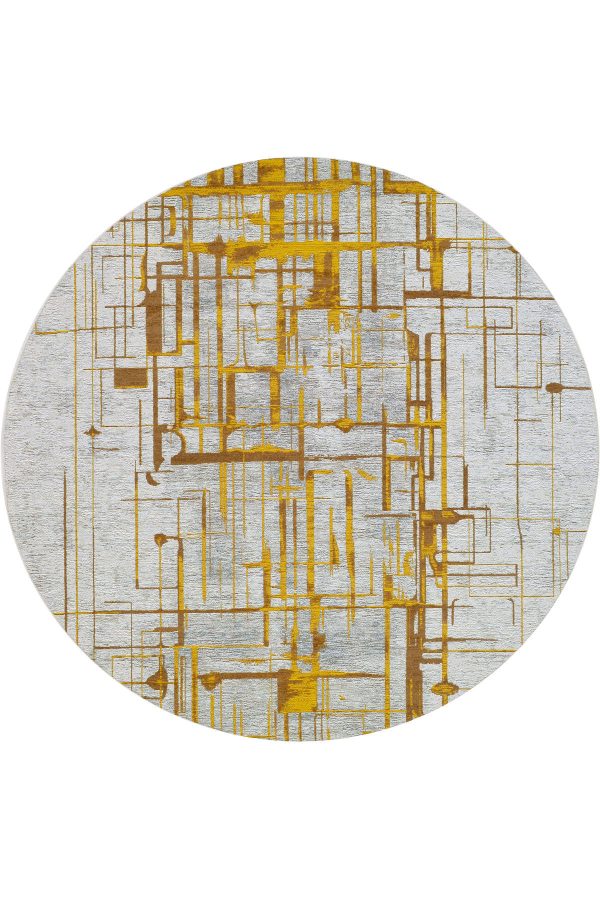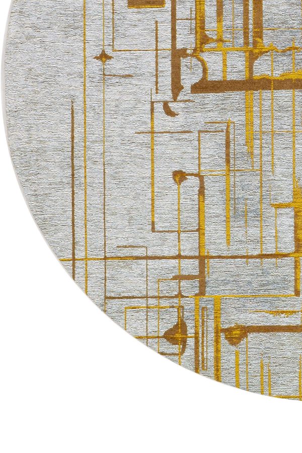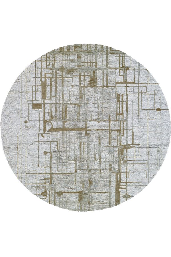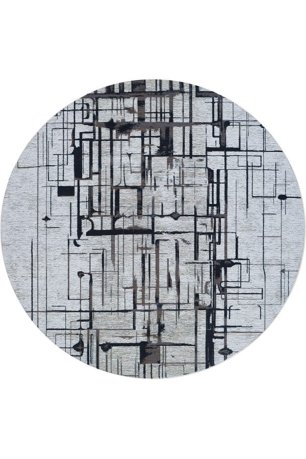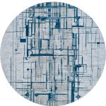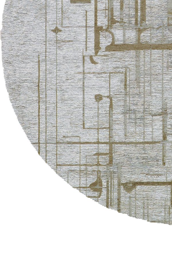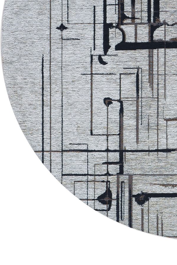 שטיח עגול בעיצוב מודרני מכני של קווים מובילים וצורות משופשפות במראה תעשייתי מעוצב.