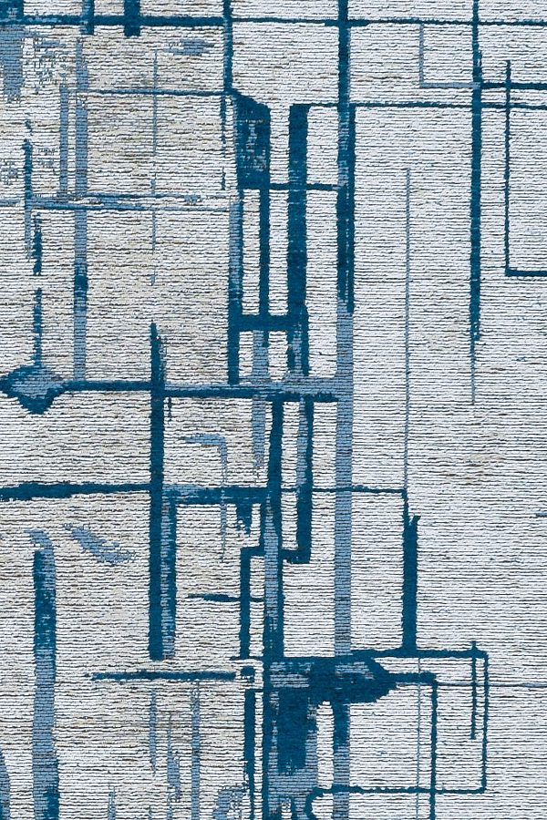 השטיח עשוי סיבי פוליאסטר בשילוב אקריליק וכותנה, ונארג במכונה עם בסיס לבן, כאשר הדוגמאות מגיעות בצבעי שחור, אפור, זהב וכחול.
