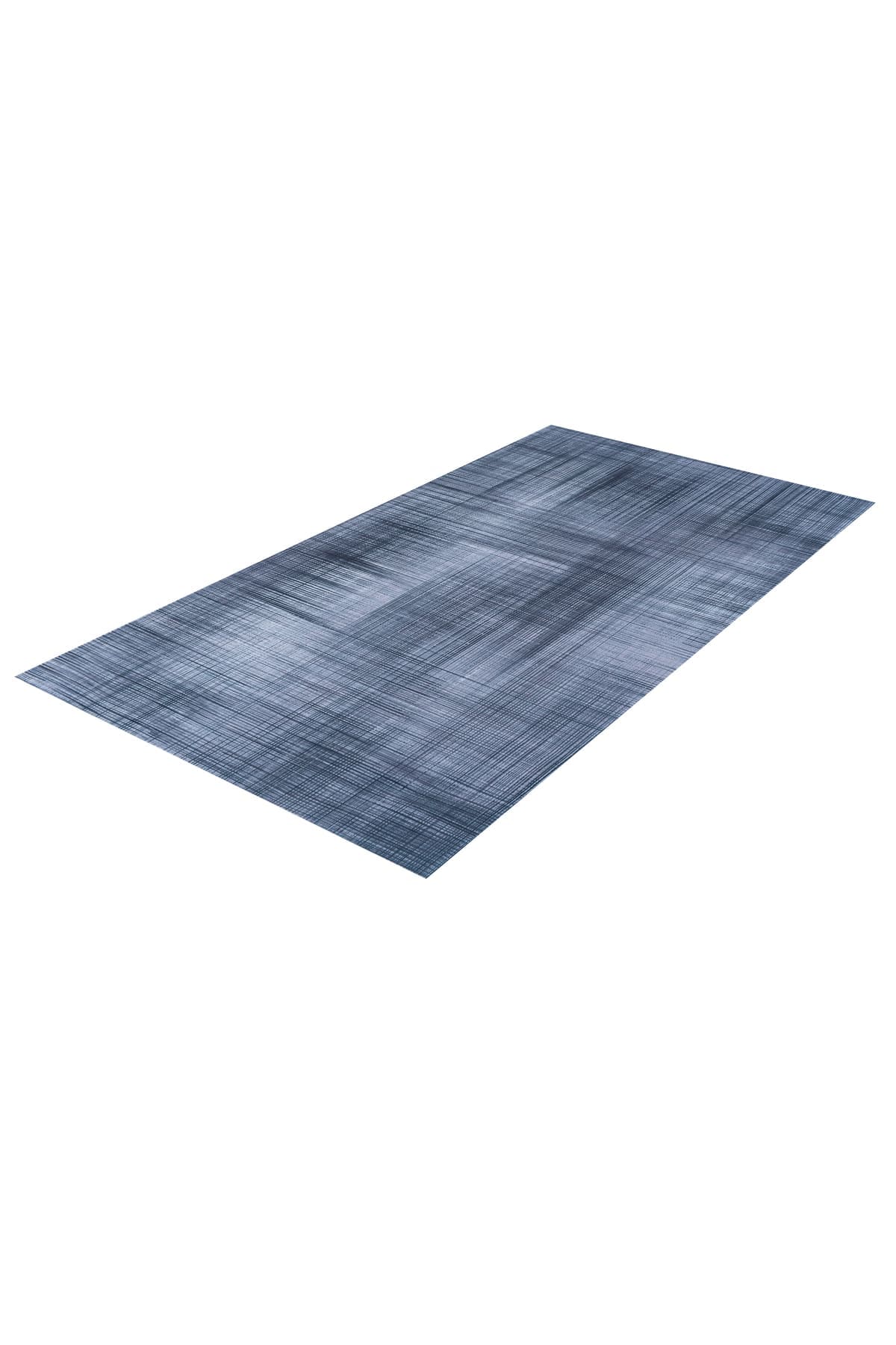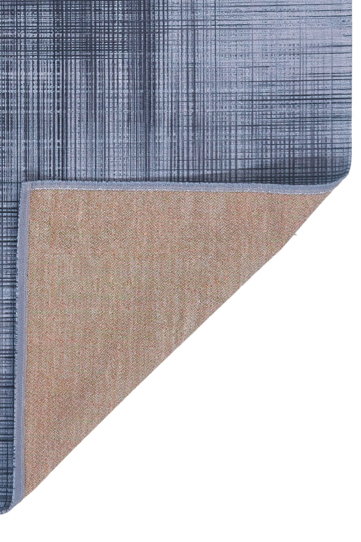 שטיח לא פחות ממושלם, בעיצוב מודרני בגוון אפור כחלחל בדוגמת קווים וקוביות בגוון כסוף.