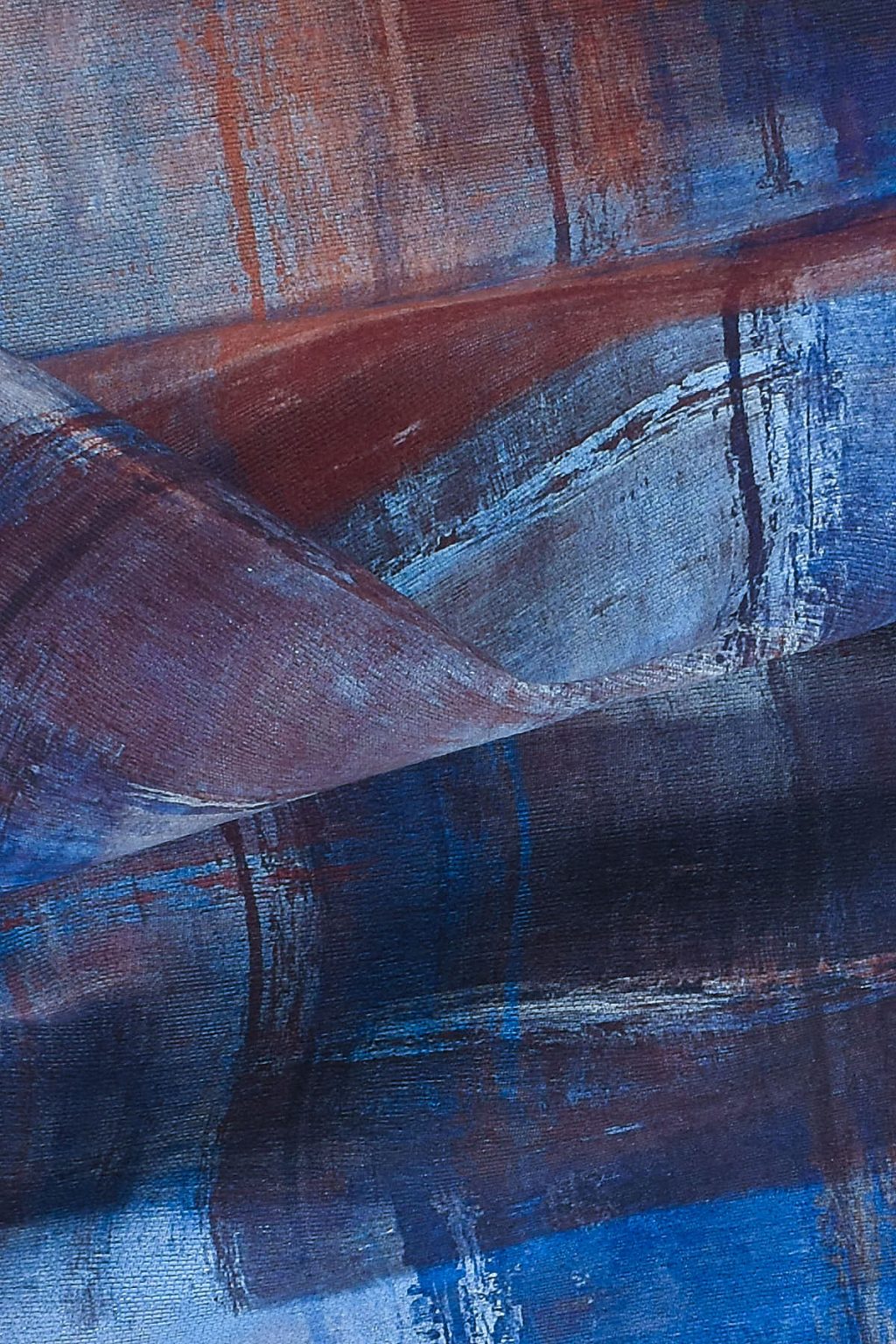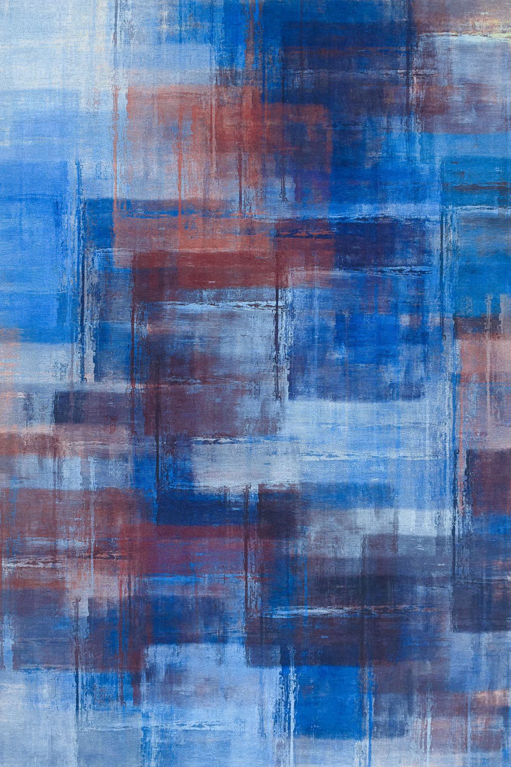 שטיח בעיצוב מודרני בצורות גיאומטריות מטושטשות, בצבע חום אדמדם בשילוב עם כחול במספר גוונים, הארוגים על בסיס אפור בהיר.