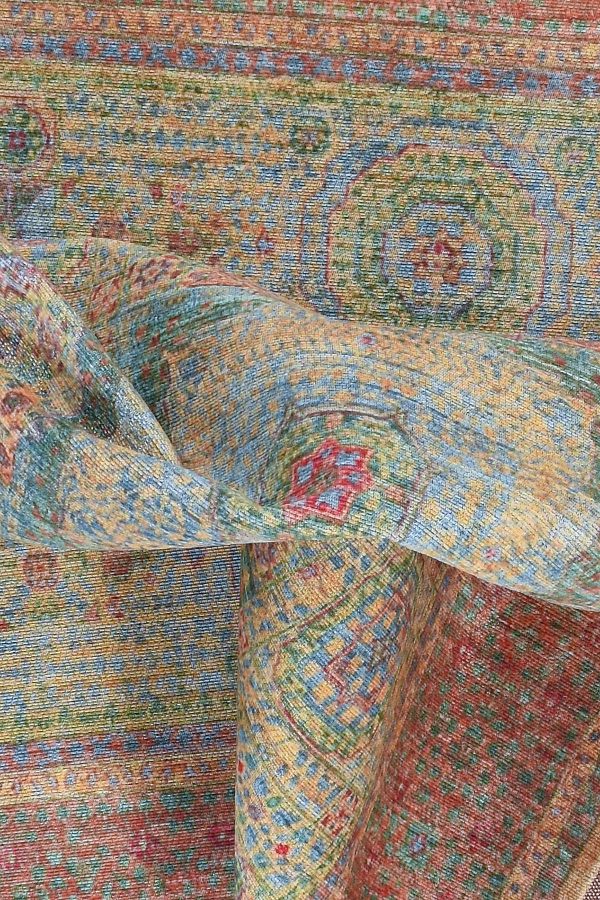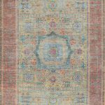 שטיח לסלון בעיצוב קלאסי הארוג בסיס ירקרק המשלב דוגמאות צבעוניות ומסגרת לשטיח, תוך שימוש בסממנים כפריים