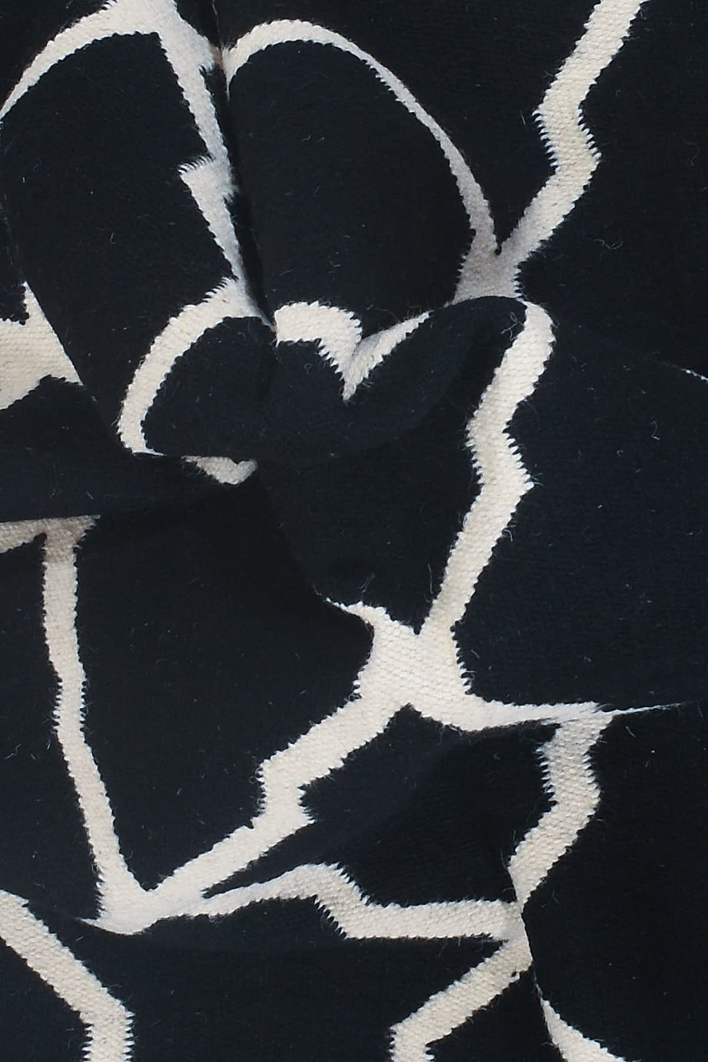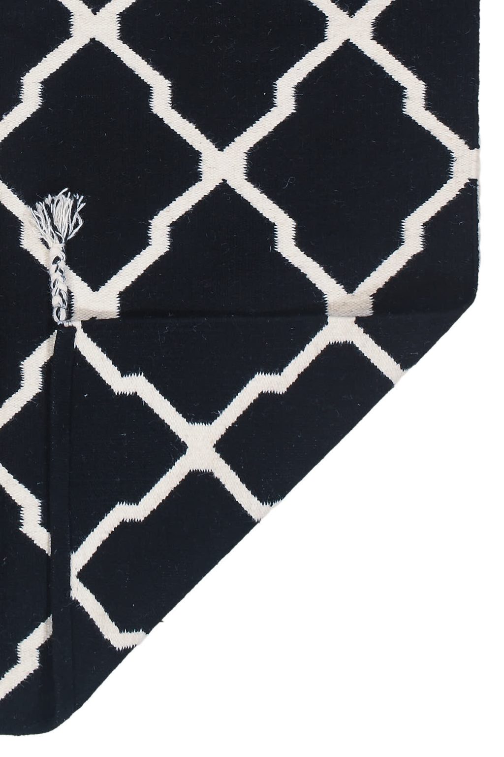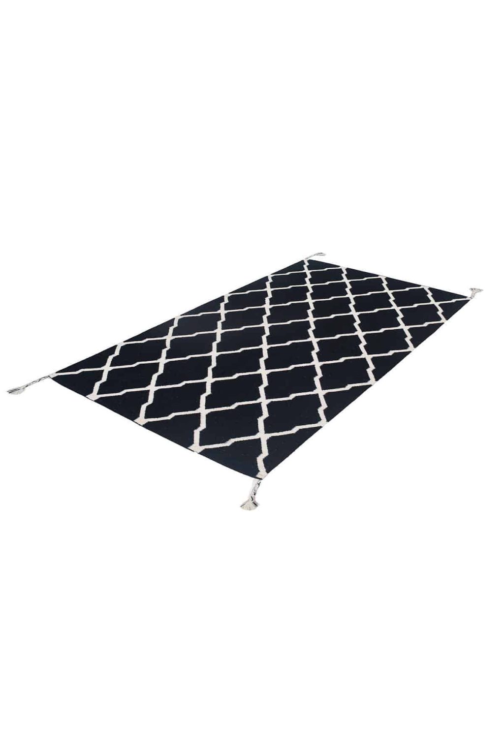 שטיח שחור לסלון בסגנון אתני נורדי שיק, עם דוגמאות גאומטריות לבנות המופיעות לכל אורכו של השטיח.
